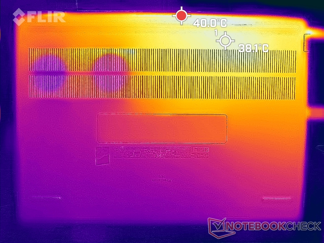 Temperatury powierzchni są rzeczywiście nieco cieplejsze od tego, co odnotowaliśmy na zwykłym Precision 7670. Gorące punkty na klawiaturze i z tyłu podczas uruchamiania wymagających obciążeń, takich jak gry przez dłuższy czas, mogą osiągnąć około 40 C każdy w porównaniu do 35 C na cieńszym zwykłym modelu. Wyniki te są zgodne z naszymi pomiarami temperatury rdzenia w następnej sekcji poniżej, gdzie nasz CPU i GPU ustabilizowałyby się w cieplejszych temperaturach.