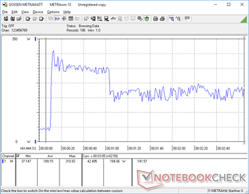 W zestawie znajduje się średniej wielkości (~15,2 x 7,8 x 2,3 cm) zasilacz sieciowy o mocy 240 W, podczas gdy zwykły Precision 7670 dostarczany jest z mniejszym zasilaczem o mocy 180 W. Udało nam się zarejestrować chwilowy maksymalny pobór mocy 311 W z zasilacza, gdy zarówno CPU, jak i GPU są wykorzystywane w 100%, co widać na poniższych zrzutach ekranu. Sugeruje to zarówno ograniczoną wydajność Turbo Boost, jak i potencjalnie niedostateczną moc zasilacza, biorąc pod uwagę, jak wymagający może być układ wewnętrzny.