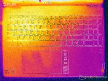 Temperatury powierzchniowe są najcieplejsze po lewej stronie systemu, gdzie gorące punkty mogą osiągnąć 38 C zarówno na górze, jak i na dole. Jest to tylko nieznacznie niższa temperatura niż w droższym Galaxy Book4 Pro 16, który jest wyposażony w znacznie szybszy Core Ultra 7 155H.