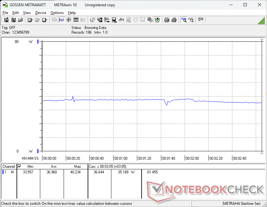 Maksymalny pobór mocy 56 W można zarejestrować z małego (~ 11,2 x 5 x 2,7 cm) zasilacza sieciowego USB-C o mocy 65 W, gdy procesor jest wykorzystywany w 100 procentach. Wskaźnik ten jest tylko tymczasowy, jak pokazano na poniższym wykresie, ze względu na ograniczenia termiczne, co jest zgodne z naszymi obserwacjami z testów warunków skrajnych powyżej.