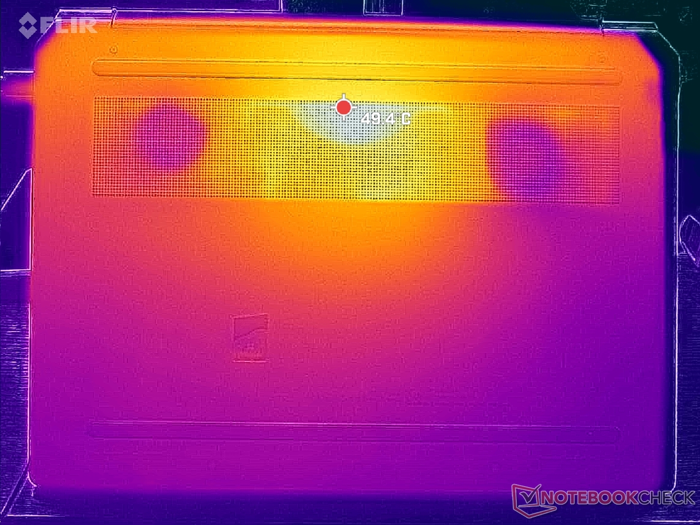 (±) 3: The average temperature for the upper side is 34.7 °C / 94 F, compared to the average of 30.8 °C / 87 F for the class Subnotebook.
