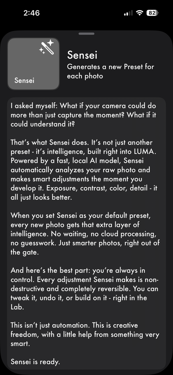 To, w połączeniu z nowym potokiem przetwarzania obrazu, pozwala na unikalną funkcję w aparacie Luma - przycisk "Test". Surowe zdjęcia są notorycznie trudne do uchwycenia, jeśli chodzi o radzenie sobie z ekspozycją, więc teraz wystarczy przytrzymać ten przycisk, aby uzyskać szybki podgląd z obsługą EDR bezpośrednio w wizjerze... Jeśli chodzi o udostępnianie presetów, to technicznie rzecz biorąc można je już udostępniać za pośrednictwem transferu plików, ponieważ są one dostępne z poziomu aplikacji Pliki. Moim celem jest stworzenie lekkiego rynku presetów, na którym użytkownicy mogliby publikować swoje style, ale uważam, że jest na to jeszcze trochę za wcześnie. W rzeczywistości była to funkcja w Luma 2 - ale to było zdecydowanie za wcześnie.