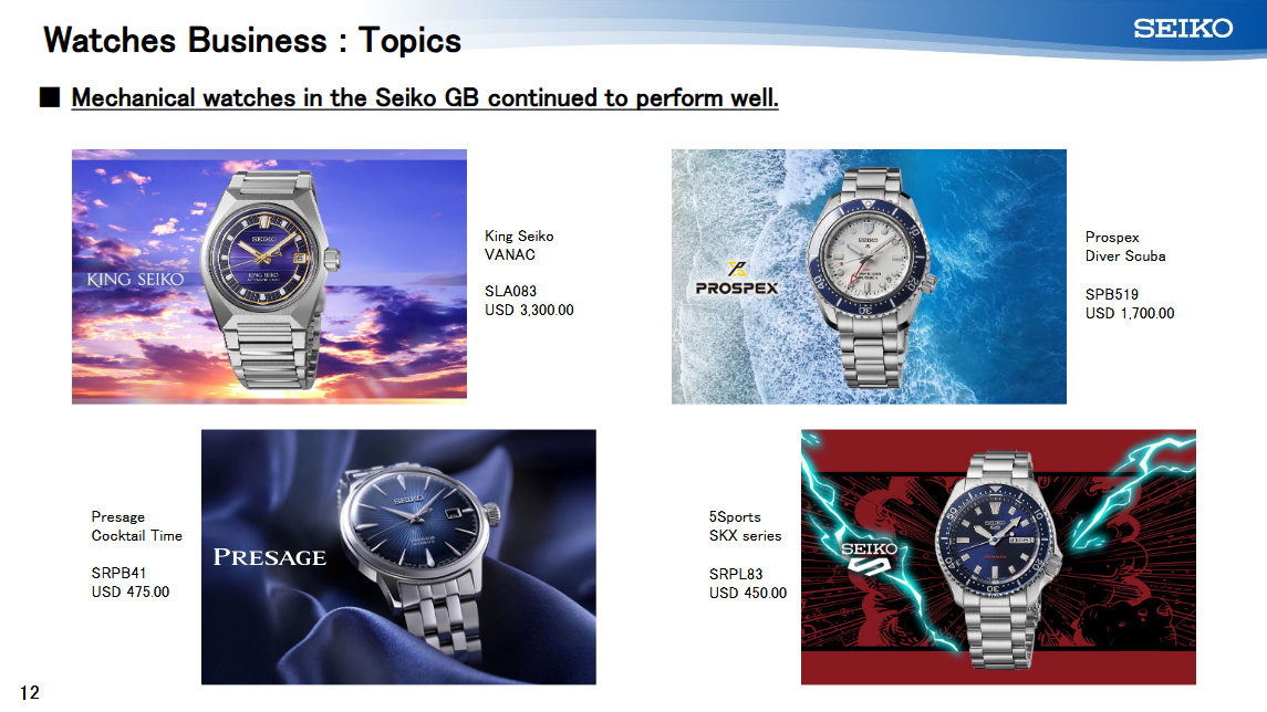Siła marki Seiko tkwi w jej szerokim zasięgu. Obejmuje on każdy segment zegarków - znajdą Państwo modele sportowe i do nurkowania, a także czasomierze codzienne i ultraluksusowe. Własne spostrzeżenia firmy pokazują, że nowe premiery w segmencie Prospex (sportowe/nurkowe), Presage (ubraniowe/mechaniczne) i Seiko 5 Sports (podstawowe automaty) pomogły zwiększyć sprzedaż. Jej wysokiej klasy oddział, Grand Seiko, staje się coraz bardziej popularny na całym świecie: sprzedaż w USA jest silna (wspomagana przez rosnącą giełdę), nawet gdy europejski popyt na luksusowe produkty spada.