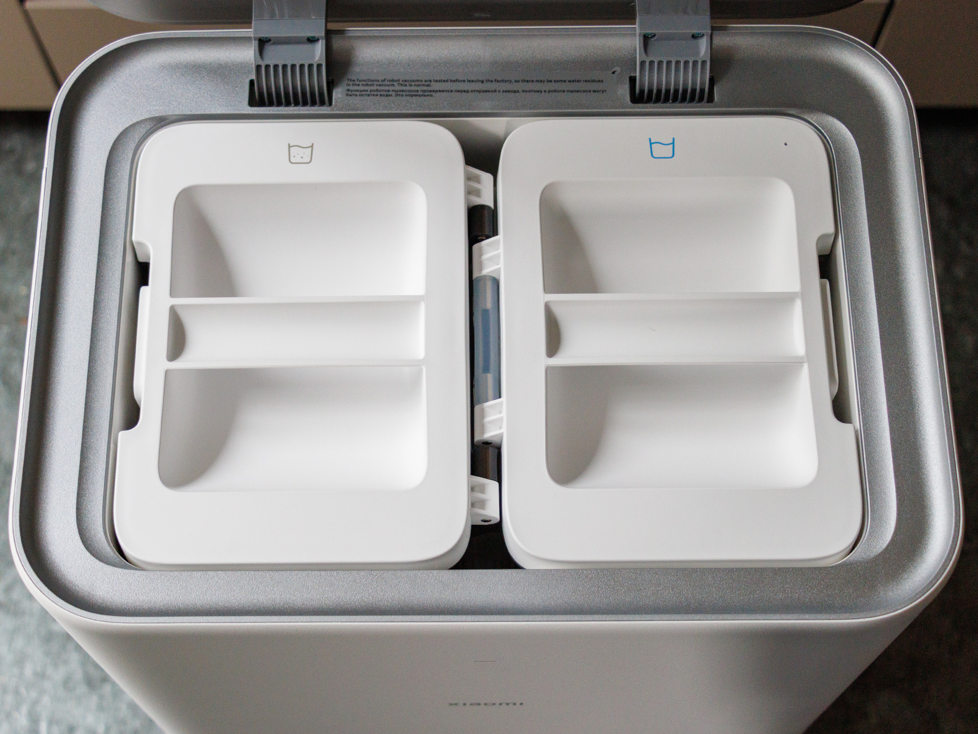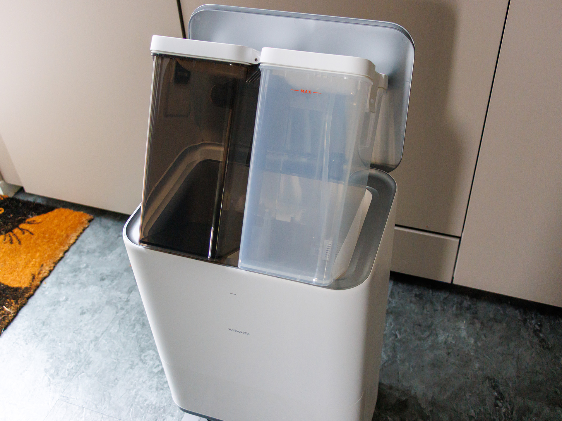 Pojemnik na kurz jest raczej mały, więc robot odkurzacz / mop musi częściej wracać do stacji ładującej podczas czyszczenia dużych powierzchni. Mopy mogą być również automatycznie czyszczone gorącą wodą o temperaturze 80°C. Niestety, Xiaomi Robot Vacuum 5 Pro nie ma zbiornika na roztwór czyszczący; zamiast tego mopuje samą wodą. Stwierdziliśmy, że ilość wody zużywanej po wyjęciu z pudełka jest dość niska, dlatego większość testu przeprowadziliśmy na poziomie 3. Pełny zbiornik wody w stacji ładującej wystarczył na nieco ponad 240 metrów kwadratowych.