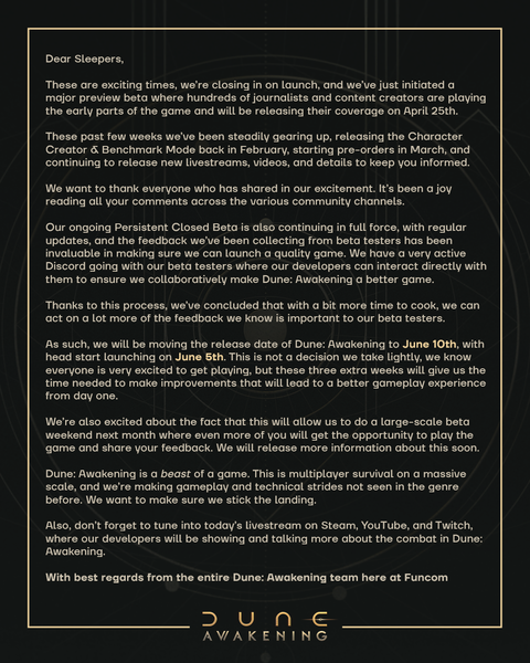 Od czasu jego ujawnienia w 2022 rokuto była długa droga do premiery Dune: Przebudzenie. W lutym gracze w końcu otrzymali aktualizację dotyczącą tytułu survival/MMO, w tym kiedy pojawi się on na komputerach PC. Podczas gdy data premiery Dune: Awakening miało ukazać się 20 maja, jednak Funcom ogłosił opóźnienie. Na szczęście gracze będą musieli poczekać tylko trzy dodatkowe tygodnie, aby odkryć niebezpieczne Arrakis. Na oficjalnym serwerze Discord deweloper ujawnił, że gra pojawi się 10 czerwca.