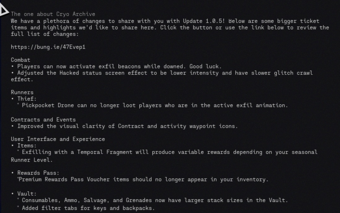 Aktualizacja 1.0.5 do gry Marathon dodaje nową strefę Cryo Archive, pozwala graczom aktywować nadajniki exfil, gdy są zestrzeleni, a także wprowadza długą listę zmian w zakresie walki, kontraktów, interfejsu użytkownika, czatu głosowego, stabilności, broni, modów i dźwięku. Bungie wprowadziło również kilka nowych łupów bezpośrednio do Archiwum Cryo, w tym dodatki do implantów i mody, które można znaleźć tylko tam.