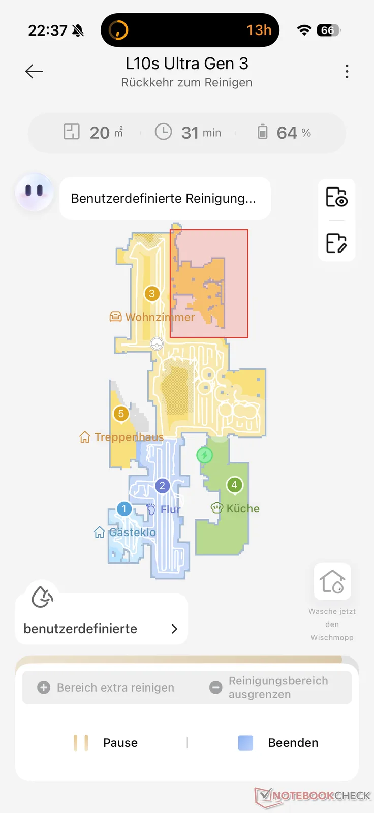 Aby porównać zużycie energii i koszty, zawsze pozwalaliśmy robotowi odkurzającemu wyczyścić 50 metrów kwadratowych w naszym środowisku testowym (głównie gładka podłoga i trochę dywanu) przy standardowych ustawieniach. Doprowadziło to do dobrego zużycia baterii na poziomie 50% dla Dreame L10s Ultra Gen 3 w teście, co oznacza, że dobre 80 metrów kwadratowych powinno być w stanie zostać pokryte na jednym ładowaniu baterii.