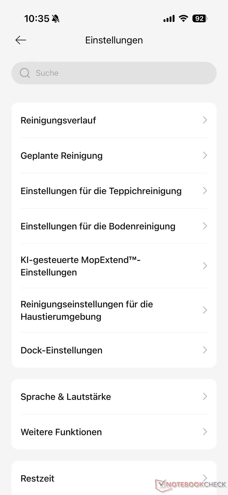 Oprócz historii czyszczenia, aktualizacji oprogramowania sprzętowego i tym podobnych, menu oferuje różne inne opcje ustawień związane z czyszczeniem dywanów, MopExtend i stacją dokującą. Wybór nie jest tak duży, jak w przypadku niektórych topowych modeli, ale jest całkowicie wystarczający dla normalnych wymagań. Jedną z praktycznych funkcji jest możliwość ładowania w mniej ruchliwych godzinach nocnych, na przykład w celu skorzystania z dynamicznych taryf energii elektrycznej.