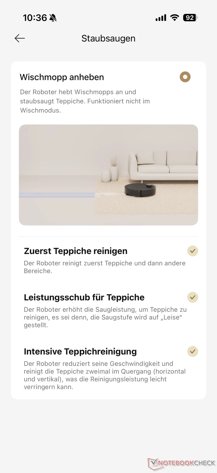 Jednak przy dłuższym włosiu model ten (podobnie jak wiele innych) czasami osiąga swoje granice. W teście kilka ziarenek piasku pozostało na testowym dywanie pomimo maksymalnego poziomu mocy ssania, mimo że dywan był dość czysty na powierzchni. Innym problemem jest to, że mopy można podnieść tylko na dobre 10 mm i nie można ich odłożyć. Rozsądnie jest najpierw aktywować czyszczenie dywanów w aplikacji, zanim zacznie się mopować pozostałe obszary.