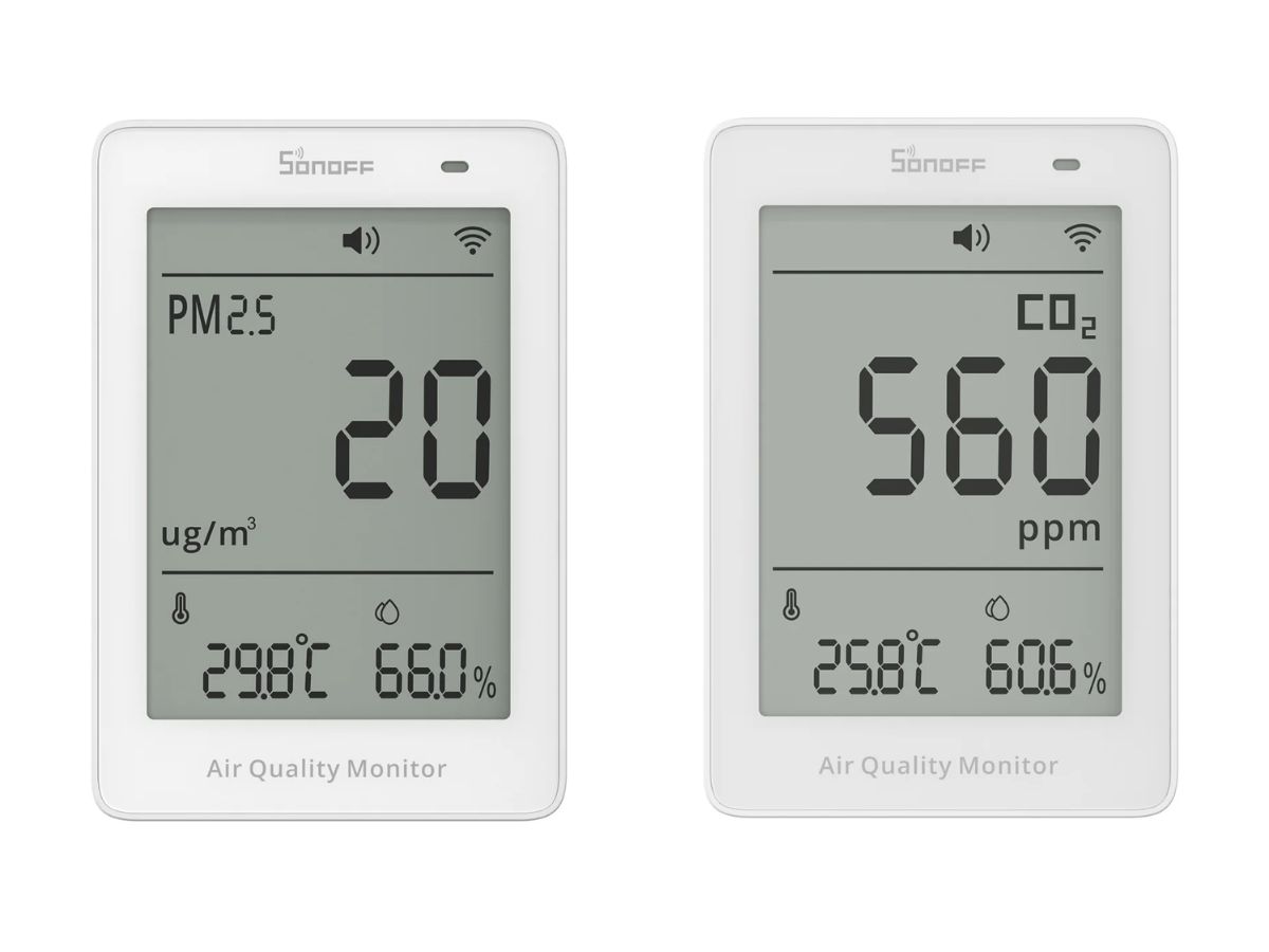 Monitor jakości powietrza Sonoff AirGuard PM2.5/PM10 to urządzenie 4 w 1, monitorujące poziomy PM2.5, PM10, temperaturę i wilgotność. Jego czujnik wykrywa cząsteczki PM2,5/PM10 powstałe w wyniku zanieczyszczenia z dokładnością ±50 µg/m3 ±10%. Monitor jakości powietrza Sonoff AirGuard CO2 jest opisywany jako gadżet 3 w 1, śledzący poziomy CO2 wraz z temperaturą i wilgotnością. Ten model ma wbudowany czujnik NDIR, dostarczający odczyty CO2 z dokładnością ±50 ppm ±5%.