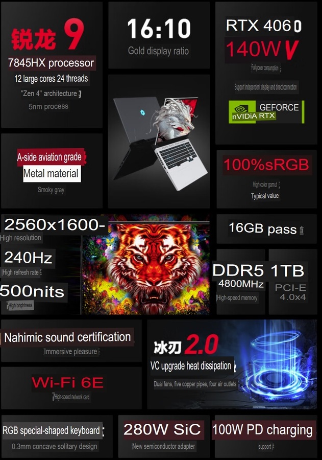 Po podjęciu decyzji o wyborze potężnego układu Dragon Range w laptopie Ryzen 9, z całą tą dobrocią mikroarchitektury Zen 4 na pokładzie, kolejną rzeczą jest wybór dedykowanego procesora graficznego, z ofertami w postaci RTX 4060, jeśli 7845HX albo RTX 4060 lub RTX 4070 w przypadku 7945HX-w przypadku konfiguracji opartej na układzie 7945HX. Potężne laptopy gamingowe MECHREVO Jiaolong 16 Pro wyposażone są również w 16 GB RAM (model 7845HX) lub do 32 GB RAM (7945HX SKU), a wszystkie warianty posiadają dysk SSD o pojemności 1 TB do przechowywania danych.