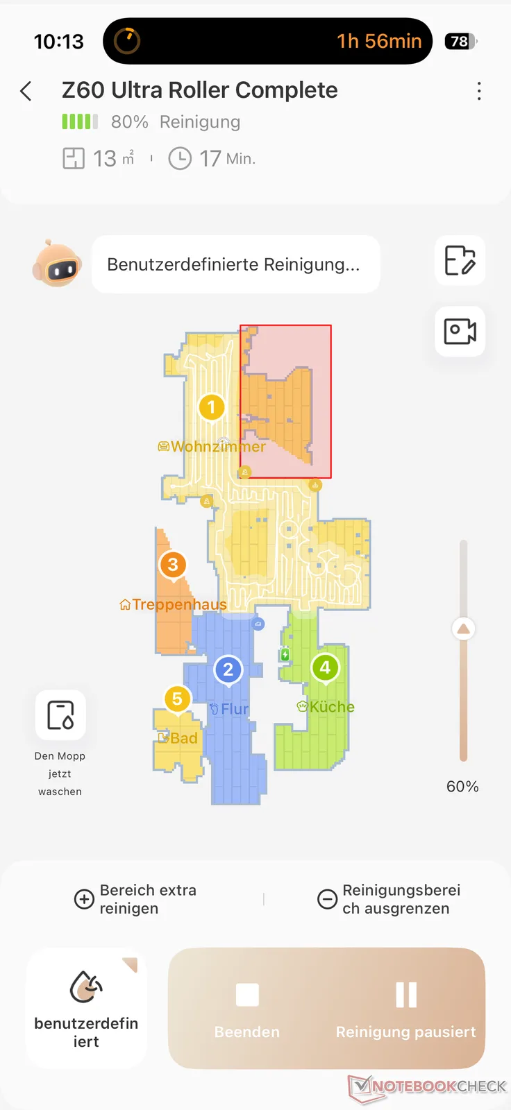 Ogólnie rzecz biorąc, nawigacja Mova Z60 Ultra Roller działała niezawodnie w teście. Nie należała jednak do najszybszych w naszym obszarze testowym. Czyszczenie trwa nieco dłużej niż w przypadku najlepszych konkurentów. W ostatecznym rozrachunku jest to jednak całkowicie akceptowalne, jeśli nie mają Państwo gości pod drzwiami w ciągu kilku minut.
