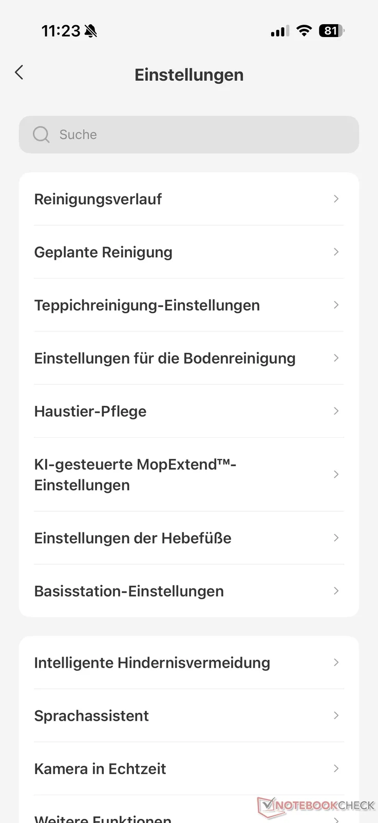 W menu dostępne są różne opcje pozwalające ustawić zachowanie robota odkurzającego i stacji. Oprócz własnego asystenta głosowego, który mówi również po niemiecku, zaplanowane sprzątanie i funkcja wideo na żywo uzupełniają funkcje udanej aplikacji Mova. Jedyną rzeczą, której nam tutaj brakowało, było wsparcie Matter.