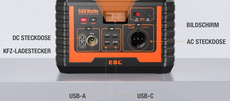 Zewnętrznie nasze poprzednio testowane elektrownie miały tendencję do prostego, szarego designu, który był rozluźniony przez jasne akcenty kolorystyczne. EBL stosuje nieco inne podejście: dzięki pomarańczowemu kolorowi MP500 wygląda nieco bardziej kolorowo i bardziej surowo. Wraz z solidnym pomarańczowym rozkładanym uchwytem, urządzenie do magazynowania energii wygląda trochę jak solidne radio z placu budowy. Dużo plastiku, widoczne kolory sygnału, stabilne, nieco surowe.
