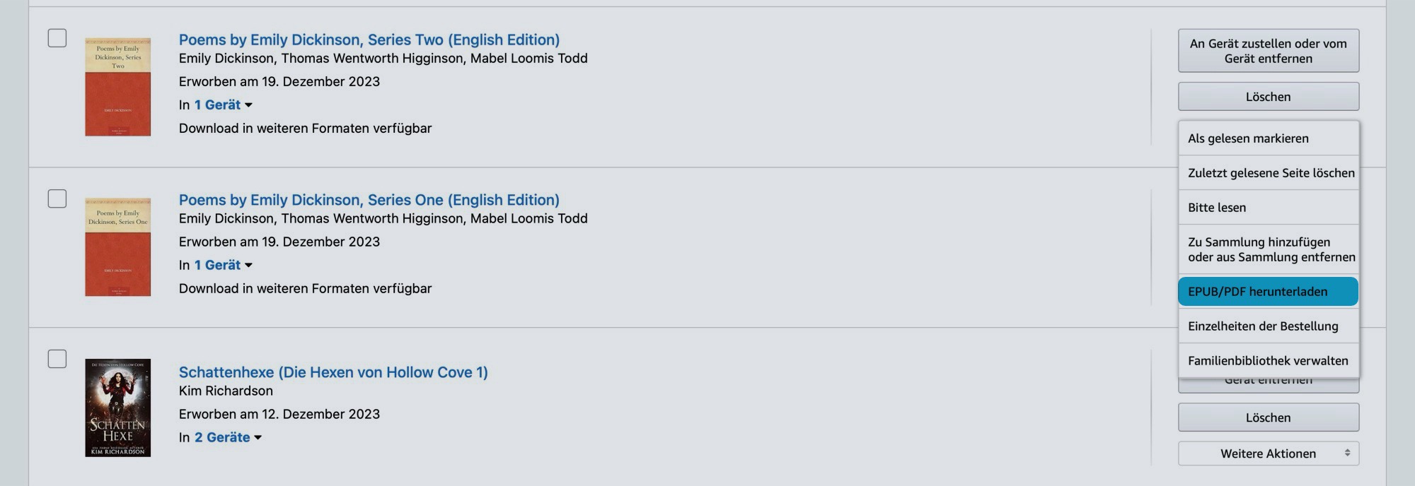 Aby pobrać eBooka, proszę wybrać go w zakładce "Treści cyfrowe" na swoim koncie Amazon. Jeśli dostępna jest wersja wolna od DRM, opcja "Pobierz EPUB/PDF" pojawi się w sekcji "Więcej działań". Umożliwia to czytanie książki na czytnikach eReader bez aplikacji Kindle. Sprzedaż bez DRM oznacza również, że książki mogą być teoretycznie udostępniane znajomym, dlatego Amazon daje wydawcom możliwość oferowania swoich książek z DRM lub bez.