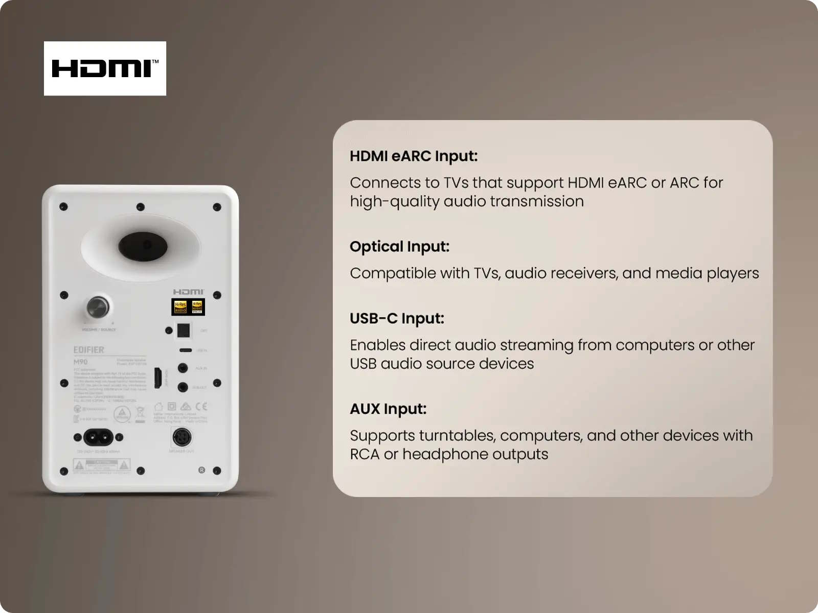 Edifier, firma znana ze swoich systemów audio, niedawno wypuściła na rynek aktywne głośniki M90. Dzięki aktywnej konstrukcji potrzebują one jedynie źródła zasilania i sygnału audio - nie wymagają zewnętrznego wzmacniacza. Oferują one szeroki zakres opcji wejściowych, w tym LDAC przez Bluetooth dla bezprzewodowego dźwięku o wysokiej rozdzielczości. Obsługiwane jest również HDMI eARC; funkcja ta nie zawsze jest spotykana w tej klasie głośników i znacznie usprawnia proces podłączania M90 do telewizora. Dodatkowe opcje wejścia obejmują optyczne audio, AUX i USB-C. System zapewnia również wyjście subwoofera, co jest przydatne, biorąc pod uwagę brak wbudowanego subwoofera.