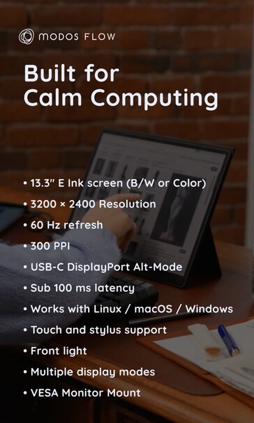 Ekran może również wyświetlać kolory, ale rozdzielczość powinna spaść do 1600 x 1200 pikseli przy 150 PPI, jak zwykle w przypadku E Ink. E Ink ma dwie główne zalety dla monitora mobilnego. Po pierwsze, zużycie energii jest znacznie niższe niż w przypadku wyświetlaczy LCD lub OLED, co oznacza, że bateria laptopa, do którego Modos Flow jest podłączony przez USB-C, jest zużywana znacznie mniej. Po drugie, wyświetlacze e-ink pozostają doskonale czytelne nawet w słońcu, z przednim podświetleniem dostępnym do użytku w nocy