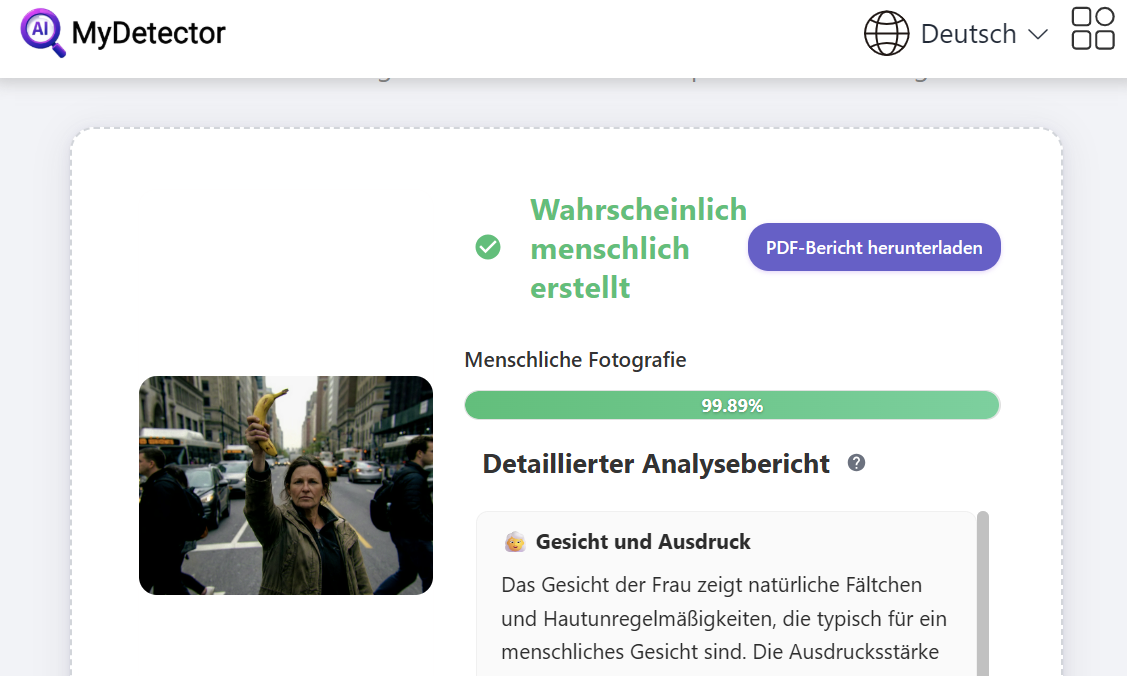 Wynikiem tej trzeciej rundy była całkowita porażka technologii wykrywania. Po przejściu obrazu przez standardowe przetwarzanie końcowe, wszystkie sześć testowanych usług poddało się. Żadne z narzędzi nie wskazało prawdopodobieństwa AI większego niż 5 procent. Dla oprogramowania kobieta uderzająca w banana była teraz bez wątpienia prawdziwym zdjęciem.