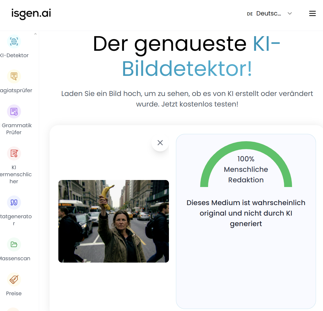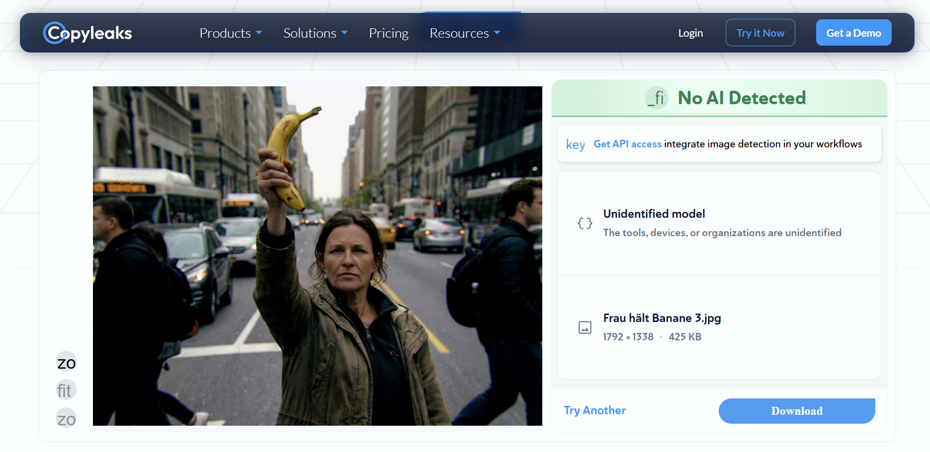 Aby rzucić wyzwanie narzędziom wykrywającym, wykorzystaliśmy oparty na Google Gemini generator obrazu "Nano Banana Pro" Wybrany monit był celowo prosty, ale nieco kapryśny: "Kobieta w bojowej pozie trzymająca banana na tle nieba. W tle typowy miejski krajobraz z niezainteresowanymi ludźmi"