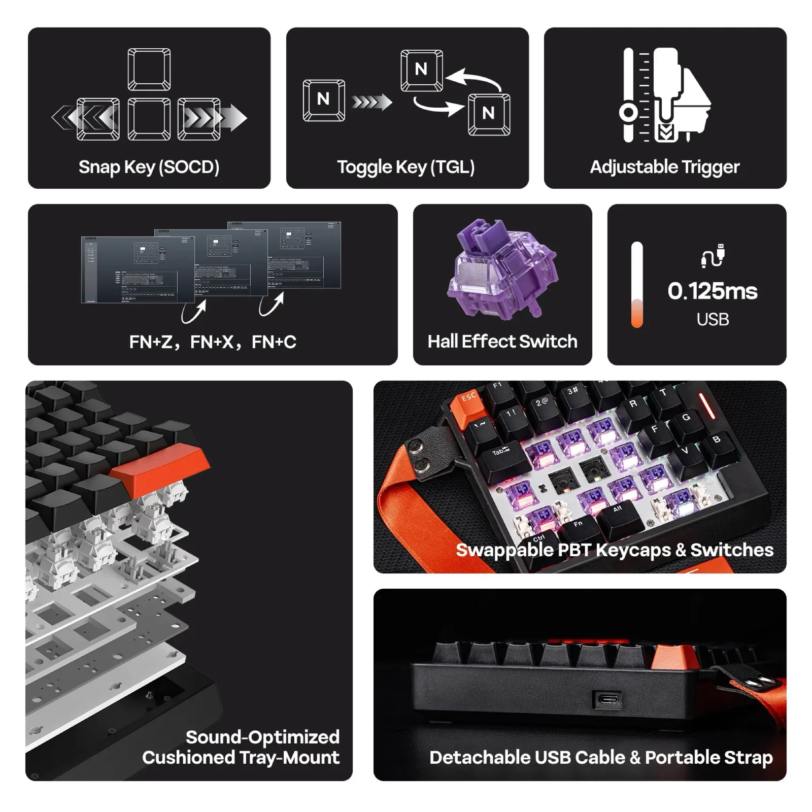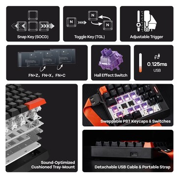 Klawiatura posiada plastikową obudowę z aluminiową płytą dla zwiększenia stabilności. Przełączniki hallotronowe zostały zaprojektowane z myślą o szczególnie szybkiej reakcji klawiszy, a punkt wyzwalania jest również regulowany. Podświetlenie RGB i nasadki klawiszy PBT są standardem. Ważąca 350 gramów klawiatura wyposażona jest w pasek na nadgarstek ułatwiający transport. Oficjalnie obsługiwane są systemy Windows i Linux, ale nie macOS.