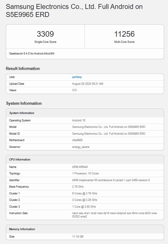 Exynos 2600 jest wymieniony w Geekbench jako "S5E9965" i posiada dziesięciordzeniową konfigurację z sześcioma rdzeniami pracującymi z częstotliwością 2,76 GHz, trzema rdzeniami z częstotliwością 3,26 GHz i głównym rdzeniem z częstotliwością 3,80 GHz. Wszystkie te częstotliwości są wyższe niż w przypadku flagowego chipsetu, gdy po raz pierwszy zadebiutował w benchmarku.