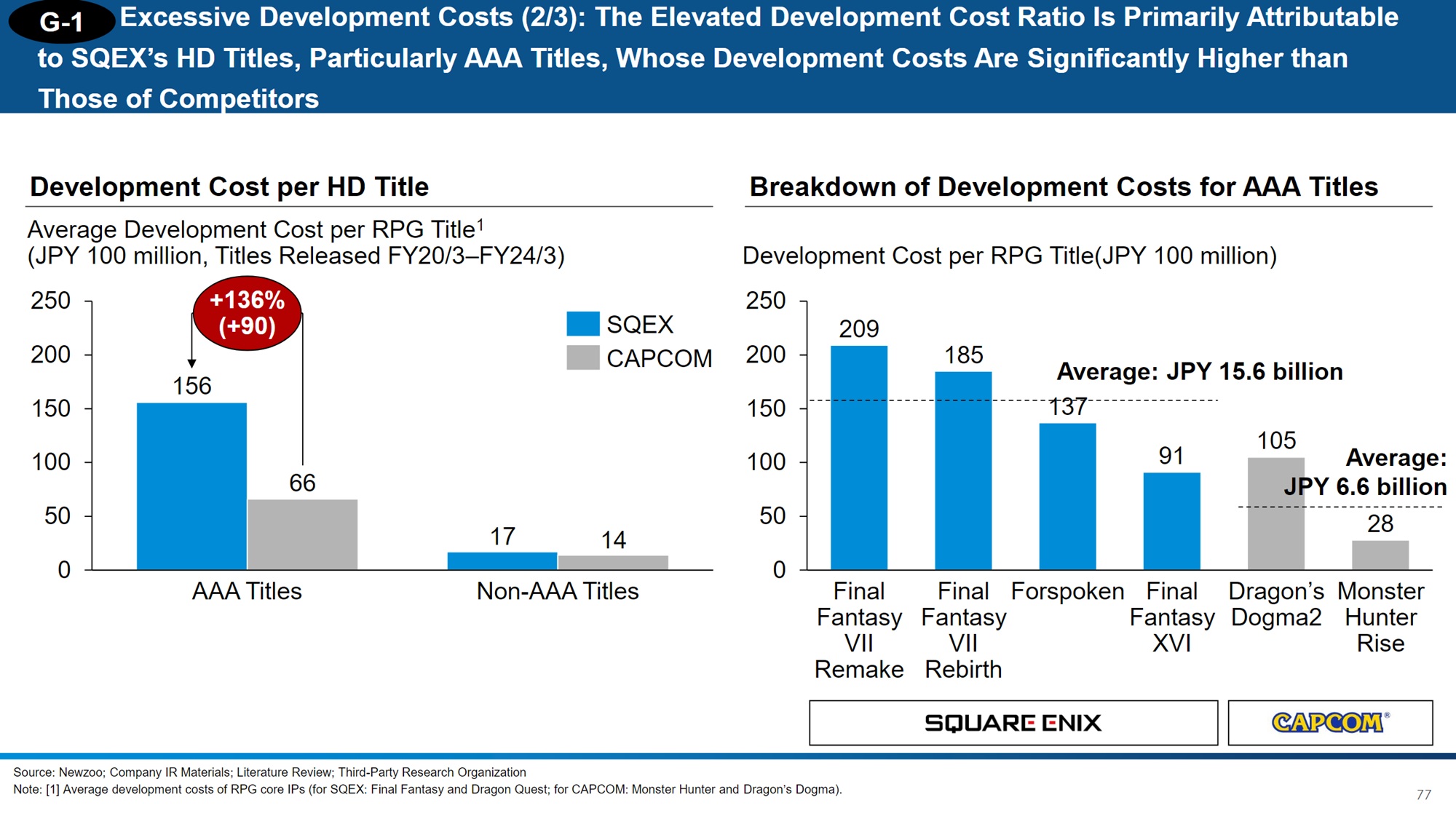 firma 3D Investment Partners opublikował serię slajdów https://www.3dipartners.com/wp-content/uploads/square-enix-presentation-material-en-202512.pdf szczegółowo opisujących rzekome marnotrawstwo wydatków firmy. Wraz z innymi akcjonariuszami firma chce "zaangażować się w konstruktywny dialog z SQEX HD w celu zwiększenia wartości korporacyjnej" Według raportu, wiele gier Square Enix było zbyt drogich w produkcji w stosunku do generowanych przez nie przychodów.