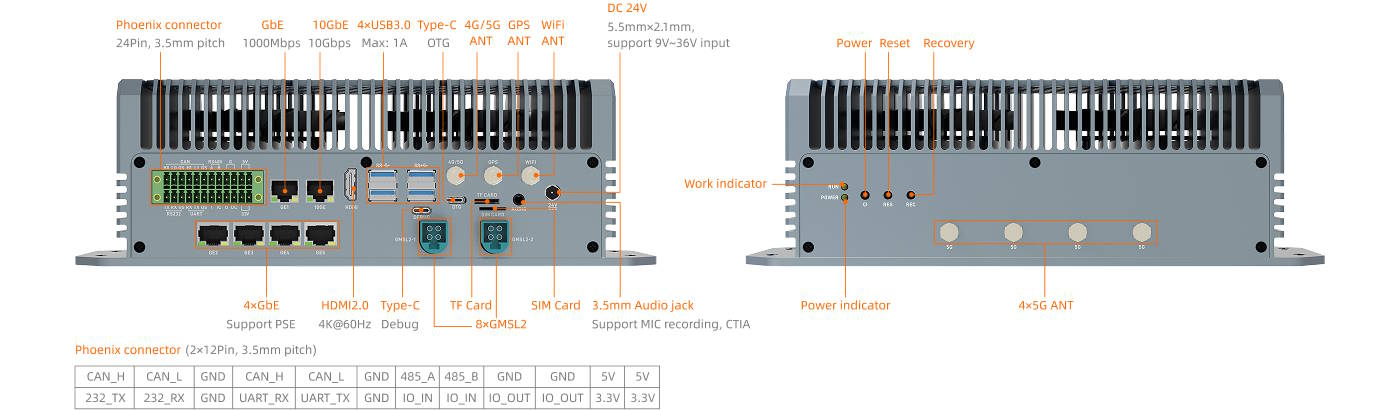 Mini PC o wymiarach 277,95 x 136,09 x 88,0 milimetrów wyposażono w 64 GB pamięci LPDDR5 RAM i pamięć eMMC o pojemności 64 GB. Można również zainstalować dysk SSD M.2 w formacie M.2 2280. Wyjście wideo może być ułatwione przez HDMI 2.0 lub przez specjalne połączenia GMSL2. Łączność sieciowa jest możliwa dzięki wielu portom Ethernet o przepustowości 10 Gb/s i 5 Gb/s. Inne porty obejmują USB 3.0, USB 3.2, złącza Phoenix, RS485, RS232, CAN 2.0 i UART.