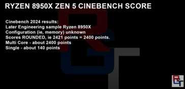 Po pierwsze, Paul twierdzi, że "późniejsza próbka inżynieryjna" Ryzen 9 8950X uzyskała 2400 punktów w wielordzeniowym benchmarku Cinebench 2024 i około 140 punktów w benchmarku jednordzeniowym. Autor przecieku sugeruje, że liczby te są zaokrąglone, więc dokładne wartości mogą być wyższe lub niższe.