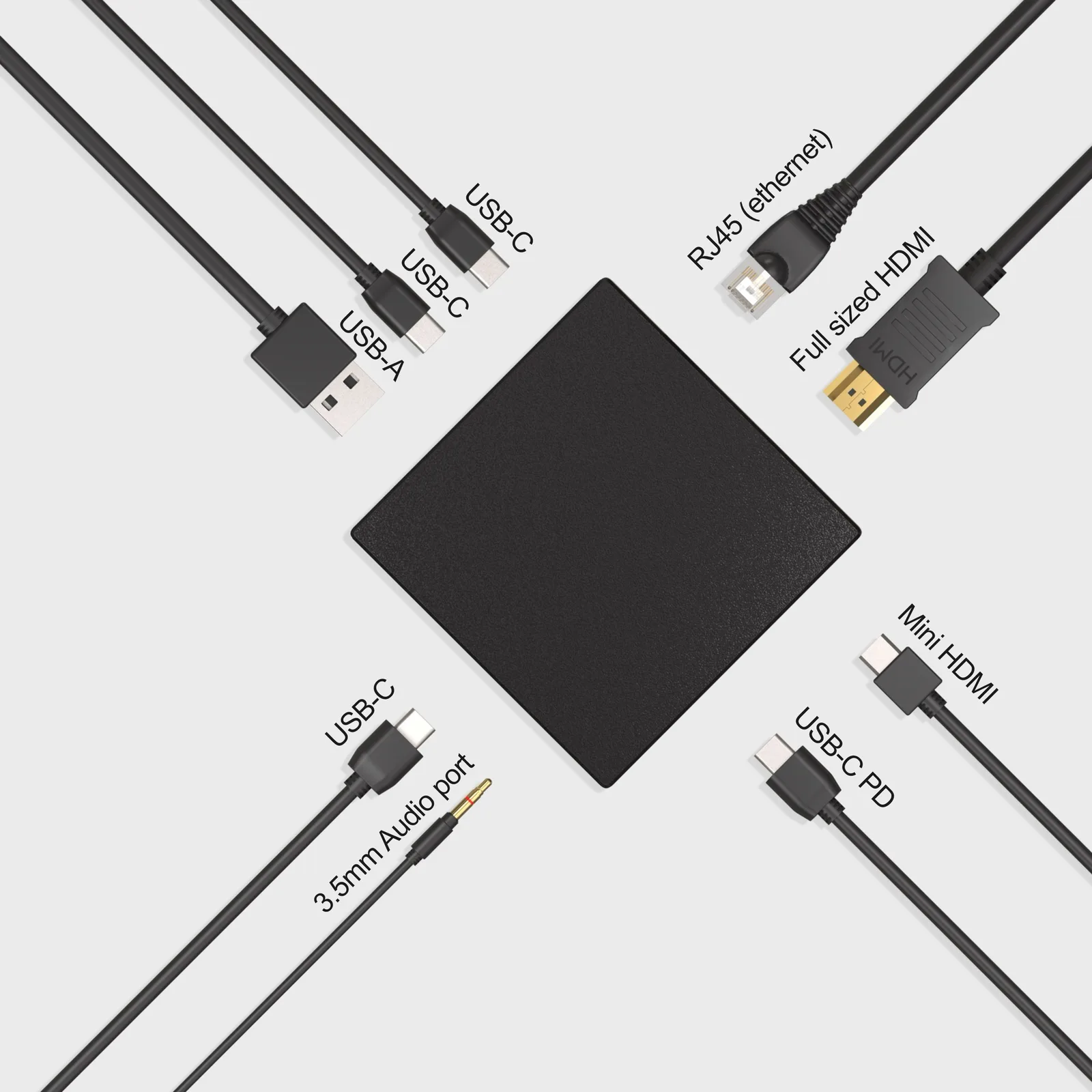 Z przodu znajduje się gniazdo słuchawkowe 3,5 mm, natomiast po prawej stronie umieszczono port USB-C z obsługą Power Delivery. W przypadku akcesoriów, Convergence Hub zapewnia dwa dodatkowe porty USB-C, a także jeden port USB-A, podczas gdy Ethernet może być używany do przewodowych połączeń sieciowych. HDMI i mini-HDMI można wykorzystać do podłączenia zewnętrznych monitorów. Chipset Synaptics DL-6950 DisplayLink teoretycznie obsługuje monitory 4K z częstotliwością do 60 Hz.