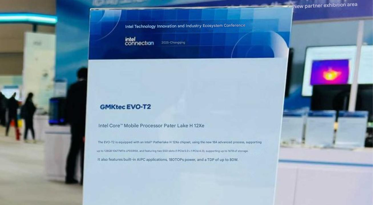 Mniej więcej sześć miesięcy później GMKtec potwierdził już szczegóły dotyczące następcy EVO-T1. Zaprezentowany na ostatniej konferencji Intela poświęconej innowacjom technologicznym i ekologii przemysłowej, EVO-T2 jest pierwszym mini-PC opartym na Panther Lake, o którym wiemy. Według GMKtec, EVO-T2 będzie dostępny z chipsetem "Panther Lake H 12xe", który będzie sprzedawany pod serią Core Ultra 300H.