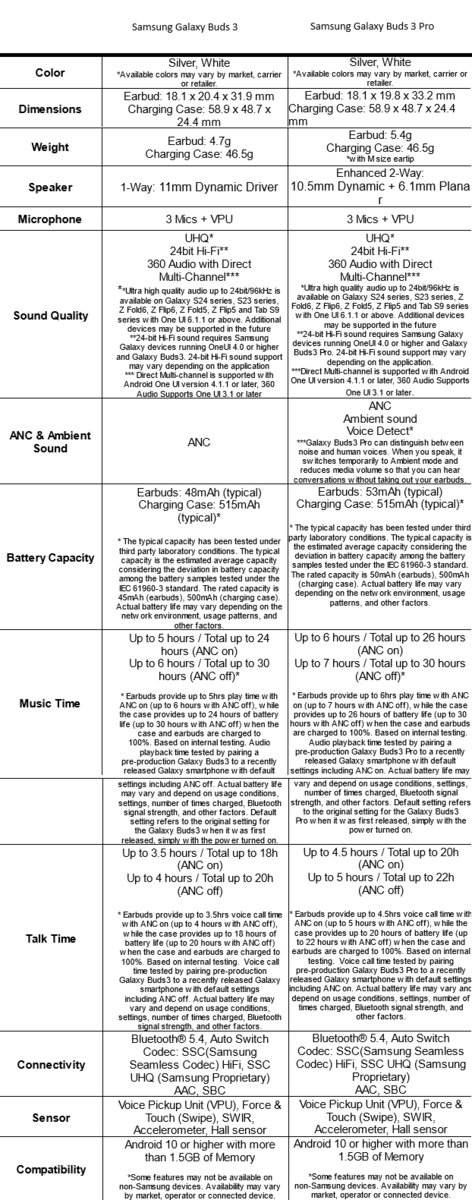 Zarówno Samsung Galaxy Buds 3, jak i Galaxy Buds 3 Pro są wyposażone w etui ładujące o pojemności 515 mAh. Obsługują 24-bitowy dźwięk Hi-Fi, który jest dostępny tylko w wybranych urządzeniach Samsung Galaxy, takich jak Galaxy S24, Galaxy S23, Galaxy Z Fold 5/6, Galaxy Z Flip 5/6.