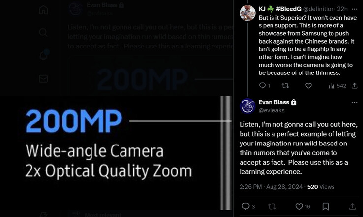 Następnie Blass opublikował na Twitterze rzekome pomiary dla Galaxy Z Fold Special Edition, które są zgodne z wcześniejszymi oczekiwaniami, że urządzenie będzie cieńsze, ale szersze niż Galaxy Z Fold6. Co więcej, teraz wywołał spekulacje, że ten pierwszy może "uzyskać poważne ulepszenie aparatu który powinien być uważany za "top-of-the-line i może potencjalnie "dopasować z Galaxy S24 Ultra. W szczególności Blass udostępnił zdjęcie, które można wywnioskować jako Galaxy Z Fold Special Edition z głównym aparatem 200 MP.