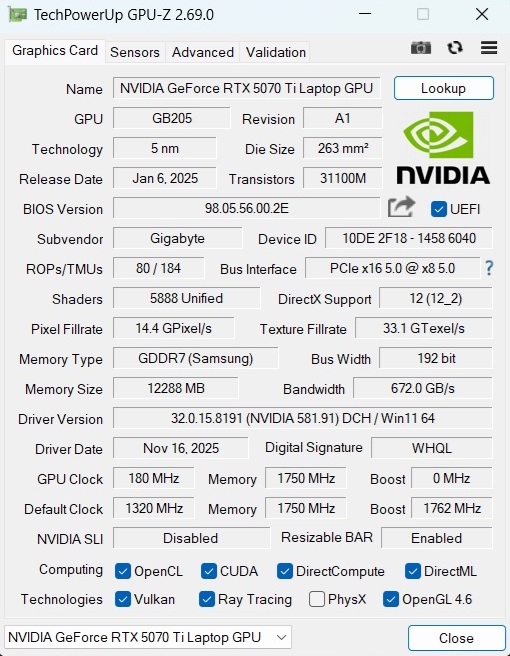 | Gigabyte Gaming A18 Pro Core 7 240H, GeForce RTX 5070 Ti Laptop | Lenovo Legion 9 18IAX10 Ultra 9 275HX, GeForce RTX 5080 Laptop | MSI Vector A18 HX A9W R9 9955HX, GeForce RTX 5070 Ti Laptop | Asus TUF Gaming A18 FA808UP-S8022W R7 260, GeForce RTX 5070 Laptop | Acer Nitro 18 AI AN18-61-R10V Ryzen AI 7 350, GeForce RTX 5070 Laptop | |