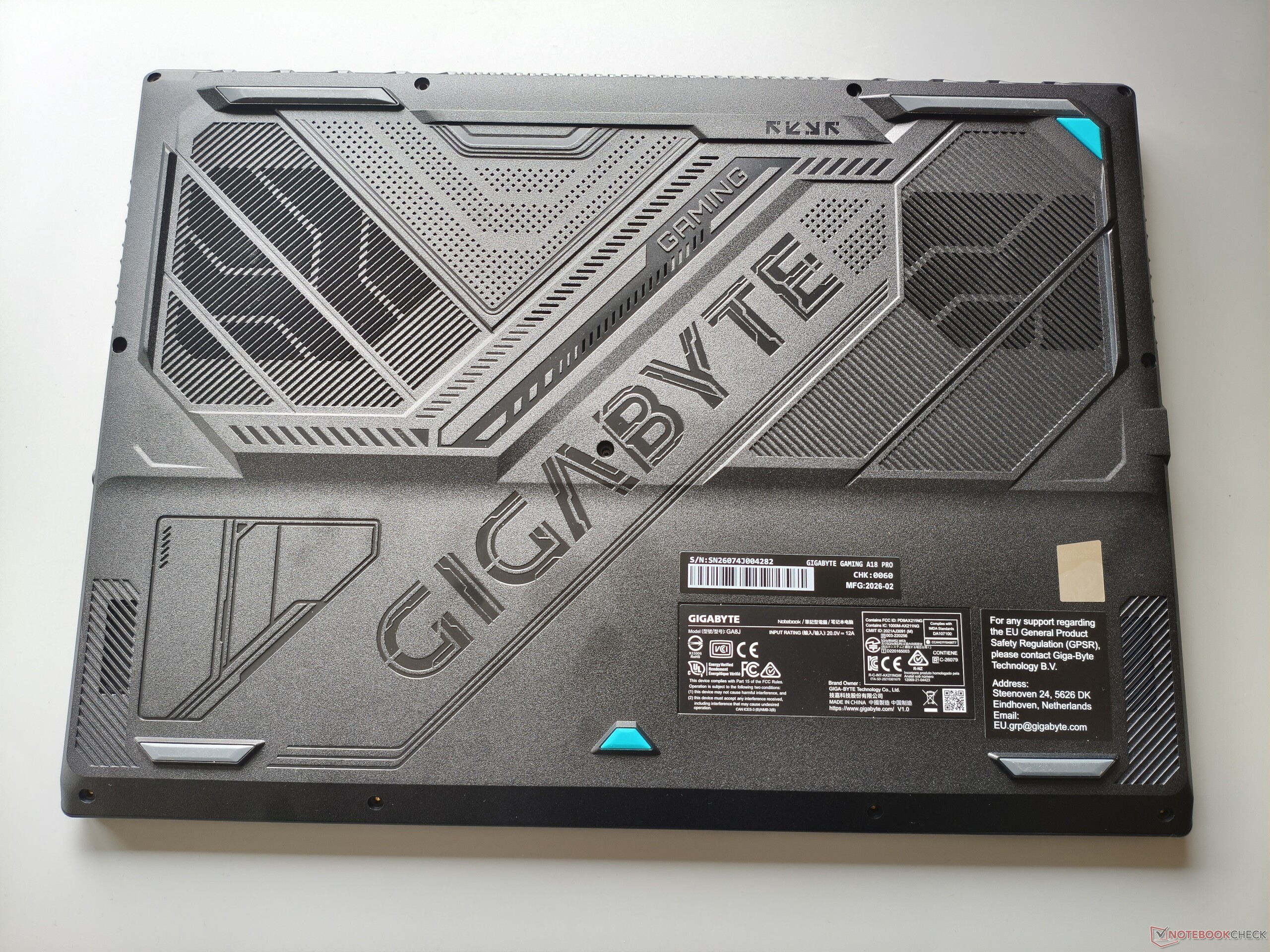 Gigabyte zdecydował się na raczej czysty design w przypadku Gaming A18 Pro, który, poza odważnie zaprojektowanym spodem obudowy, unika większych eksperymentów. Ciemnoszare powierzchnie sprawiają wrażenie solidnych i stabilnych w większości obszarów, a zawiasy - pozwalające na otwarcie wyświetlacza do 180° - pełnią swoją funkcję w większości dyskretnie. To samo dotyczy jakości wykonania, która nie pozostawia wiele do życzenia.
