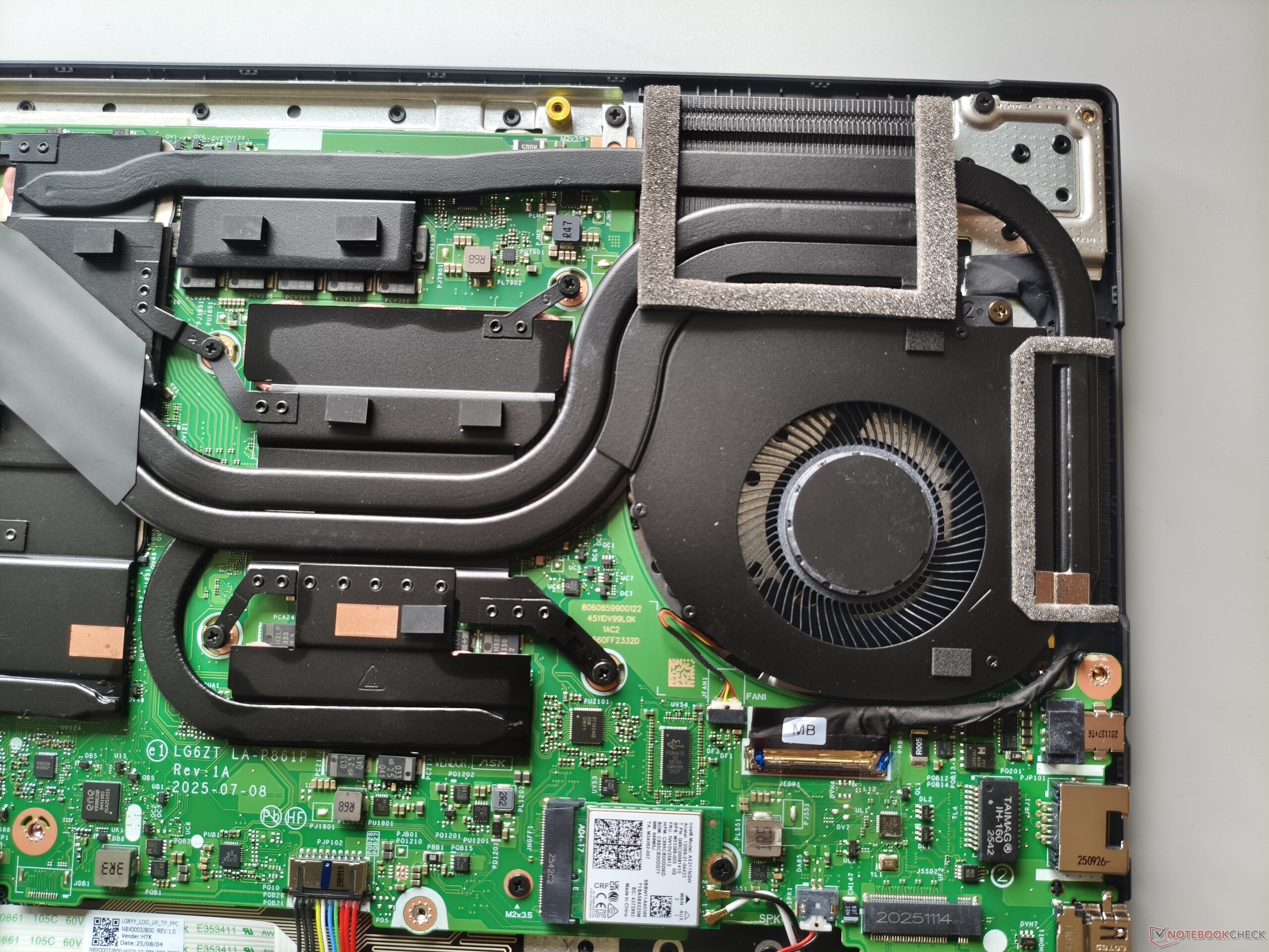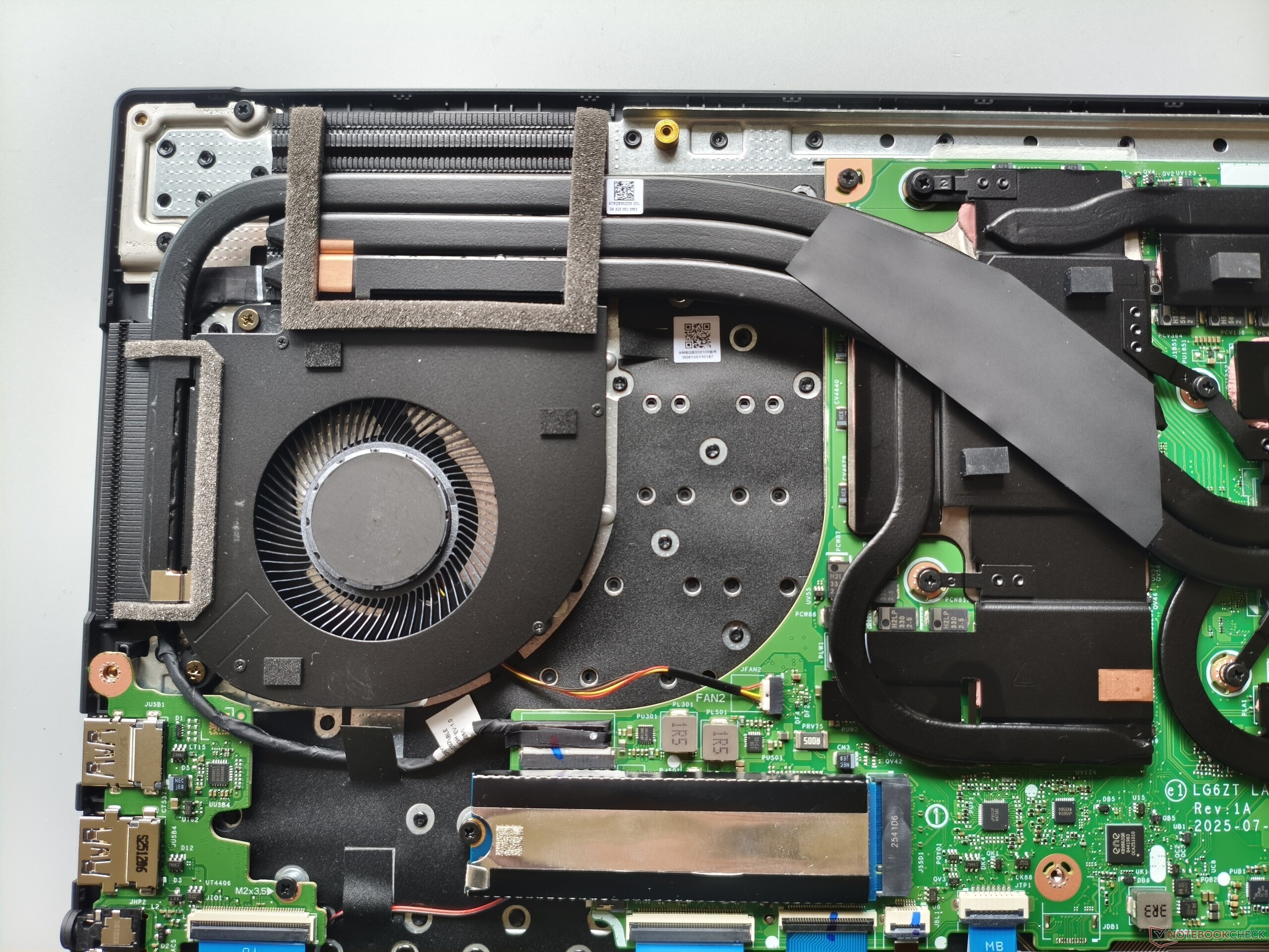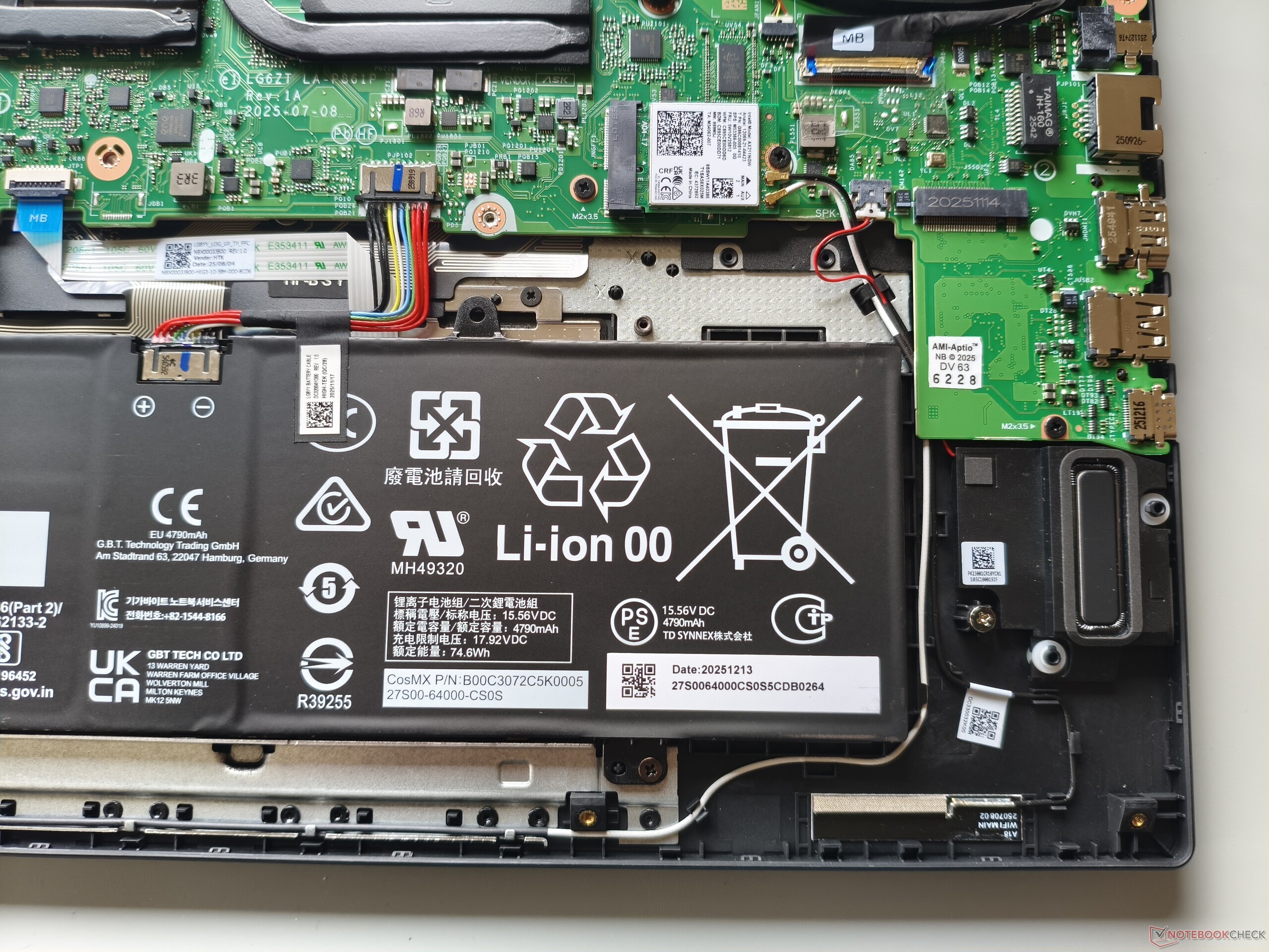 Dolny panel można zdjąć po odkręceniu 11 śrub krzyżakowych. Pod spodem okazuje się, że znalazłoby się miejsce na większą baterię. Dwa gniazda M.2 na dyski SSD (z których jedno jest nadal wolne) są całkiem przyzwoite, ale przylutowana pamięć RAM i brak gniazd SO-DIMM są wadą z perspektywy aktualizacji.