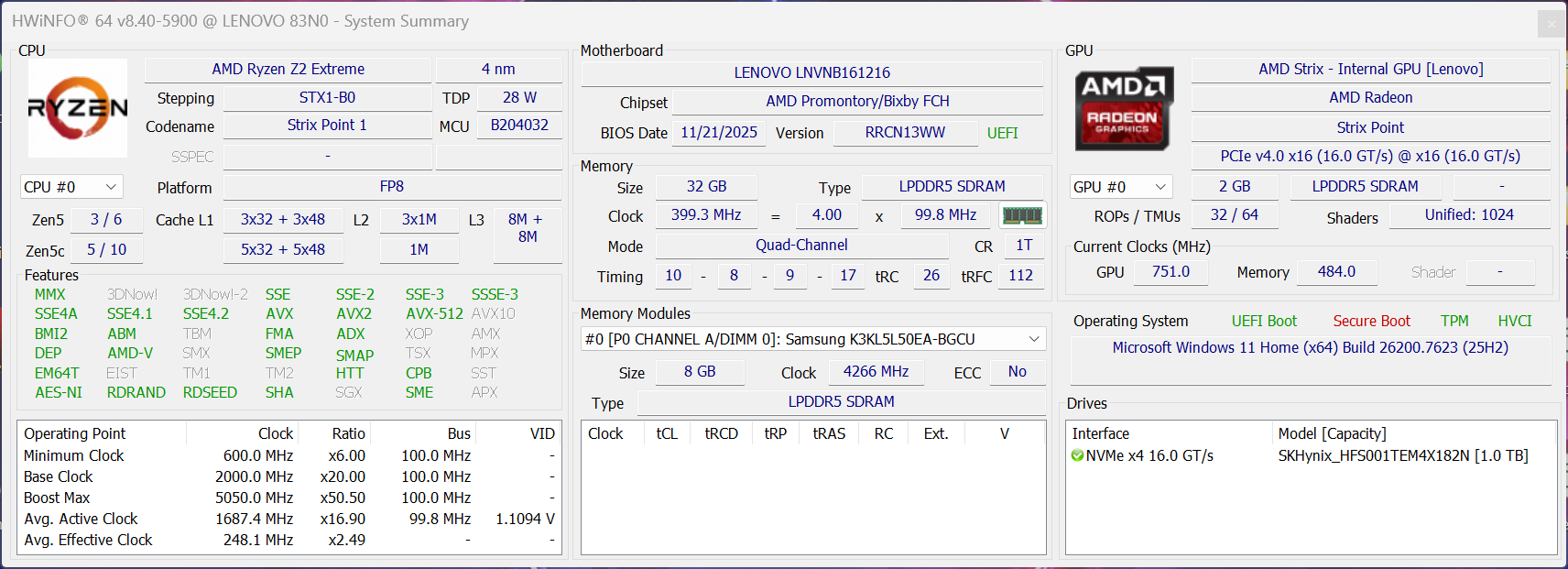 | Lenovo Legion Go 2 Ryzen Z2 Extreme, Radeon 890M, SK hynix PVC10 HFS001TEM4X182N, OLED, 1920x1200, 8.8" | Asus ROG Xbox Ally X Ryzen Z2 Extreme, Radeon 890M, Samsung MZVMA1T0HCLD, IPS, 1920x1080, 7" | MSI Claw A8 BZ2EM Ryzen Z2 Extreme, Radeon 890M, Micron 2500 1TB MTFDKBA1T0QGN, IPS, 1920x1200, 8" | ONEXPLAYER X1 Pro GA15H-HX370-32GB-1TB-H Ryzen AI 9 HX 370, Radeon 890M, Acer N7000 1 TB, IPS, 2560x1600, 11" | GPD Pocket 4 Ryzen AI 9 HX 370, Radeon 890M, , IPS, 2560x1600, 8.8" | MSI Claw 8 AI+ Core Ultra 7 258V, Arc 140V, Kioxia BG6 KBG60ZNS1T02, IPS, 1920x1200, 8" | Lenovo Legion Go Z1 Extreme, Radeon 780M, WD PC SN740 512GB SDDPMQD-512G-1101, IPS, 2560x1600, 8.8" | Przeciętny AMD Radeon 890M | Średnia w klasie Handheld / UMPC | |