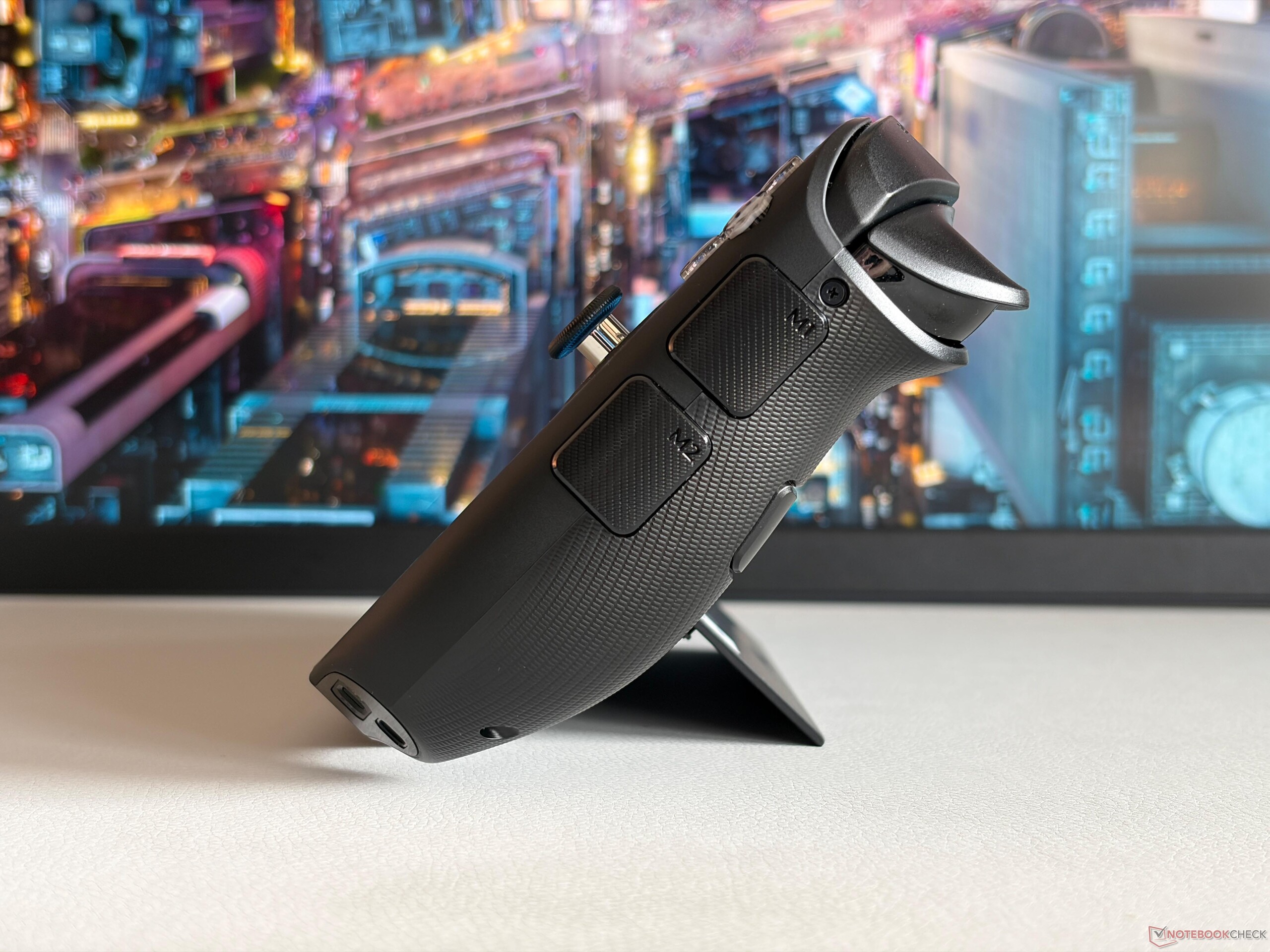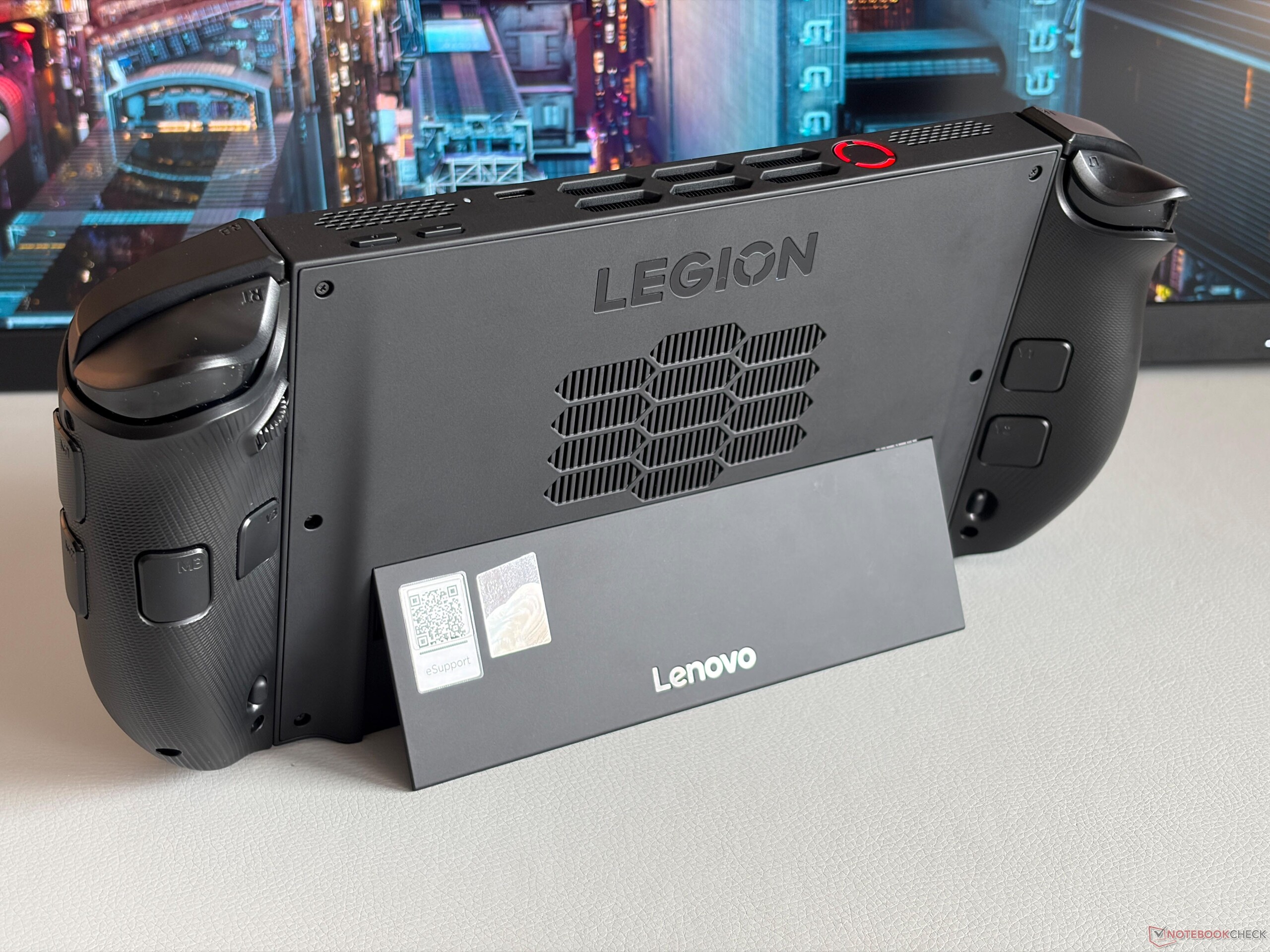 Ogólna konstrukcja Legion Go 2 pozostaje w zgodzie ze swoim poprzednikiem. Czarna plastikowa obudowa jest w dużej mierze gładka i sprawia wrażenie wysokiej jakości, a teksturowane powierzchnie znajdują się tylko z tyłu dwóch uchwytów, aby poprawić obsługę. Uchwyty nadal można odłączyć, umożliwiając na przykład umieszczenie jednostki centralnej z wyświetlaczem i wewnętrznym sprzętem na stole. Zintegrowana podpórka pozostaje stosunkowo cienka, ale nie jest już tak łatwa do zginania, jak w poprzednim modelu.