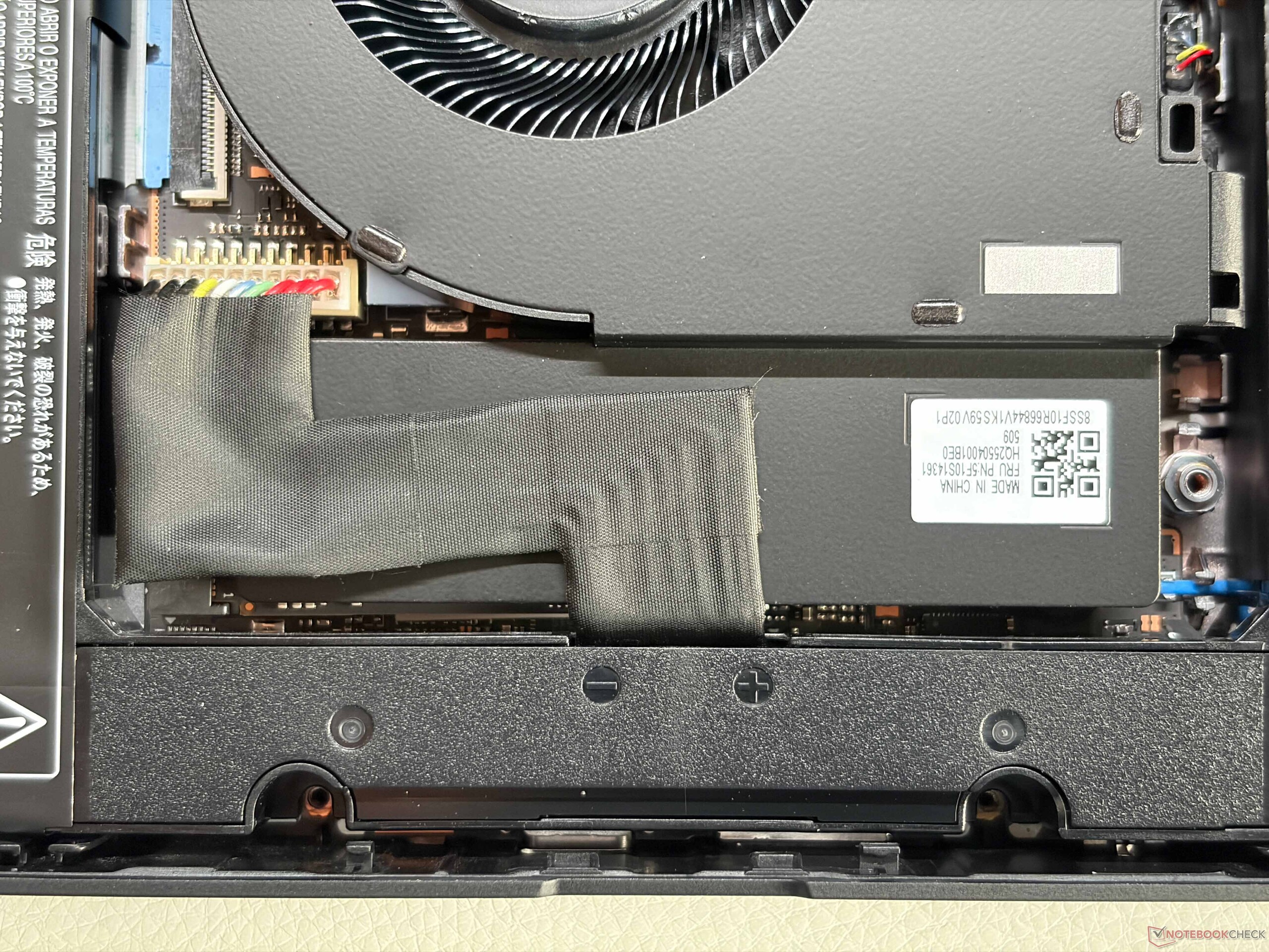 Wewnętrznie, układ również został przeprojektowany. Baterie są teraz umieszczone po obu stronach, a pojedynczy wentylator znajduje się pośrodku. Dysk SSD M.2 2280 znajduje się pod spodem i można go wymienić, chociaż najpierw należy odłączyć połączenie kablowe. Pomimo wysokiej ceny, urządzenie nadal nie obsługuje Wi-Fi 7.
