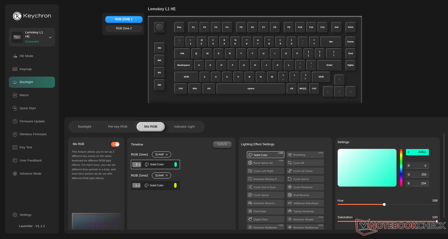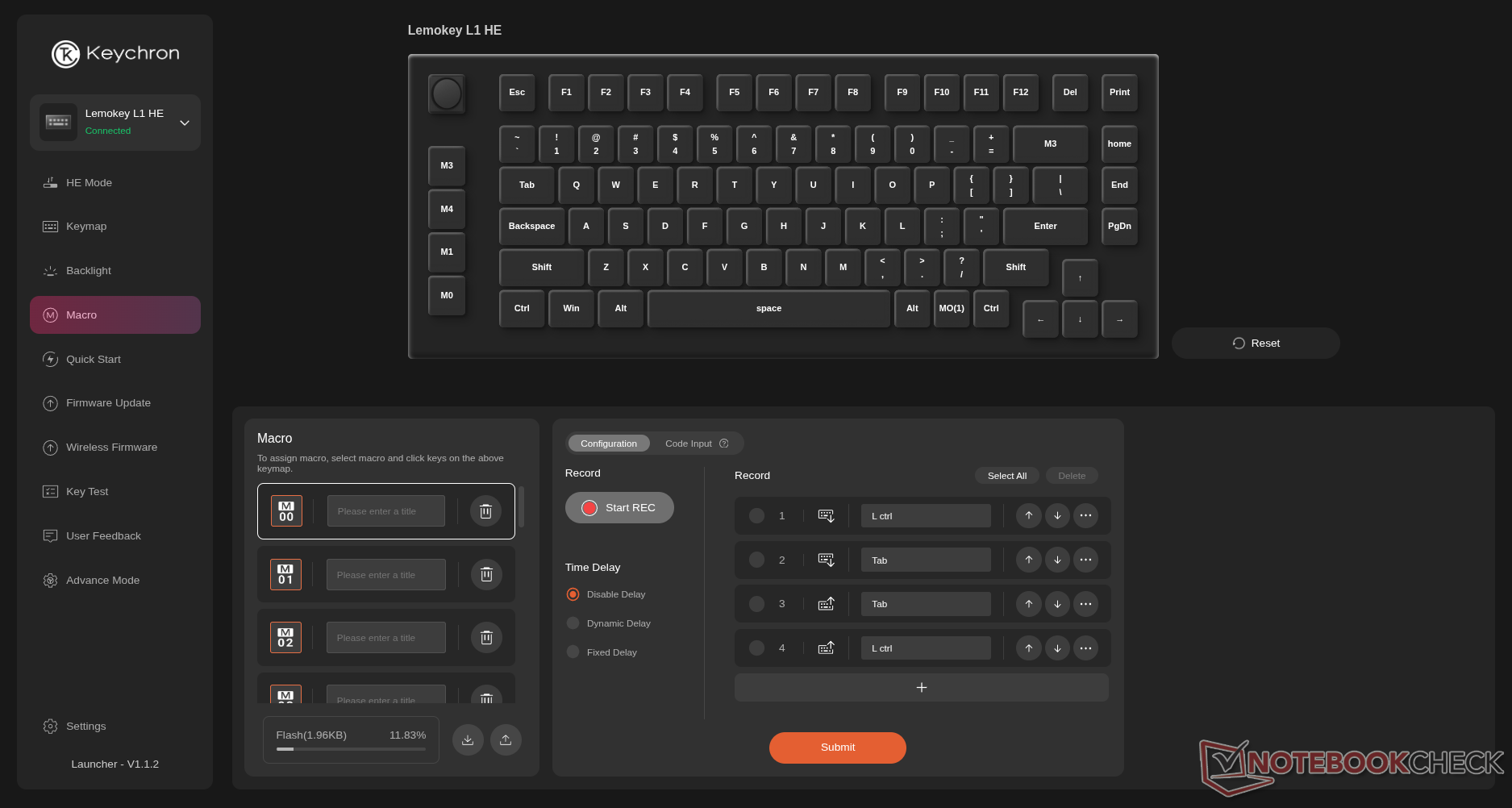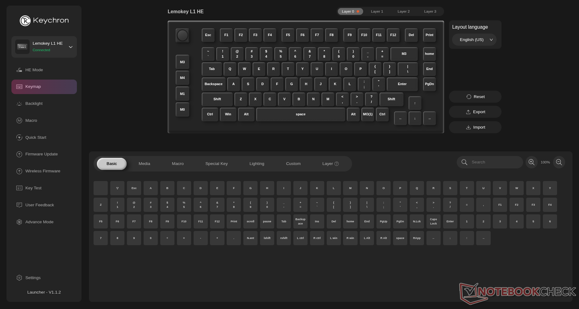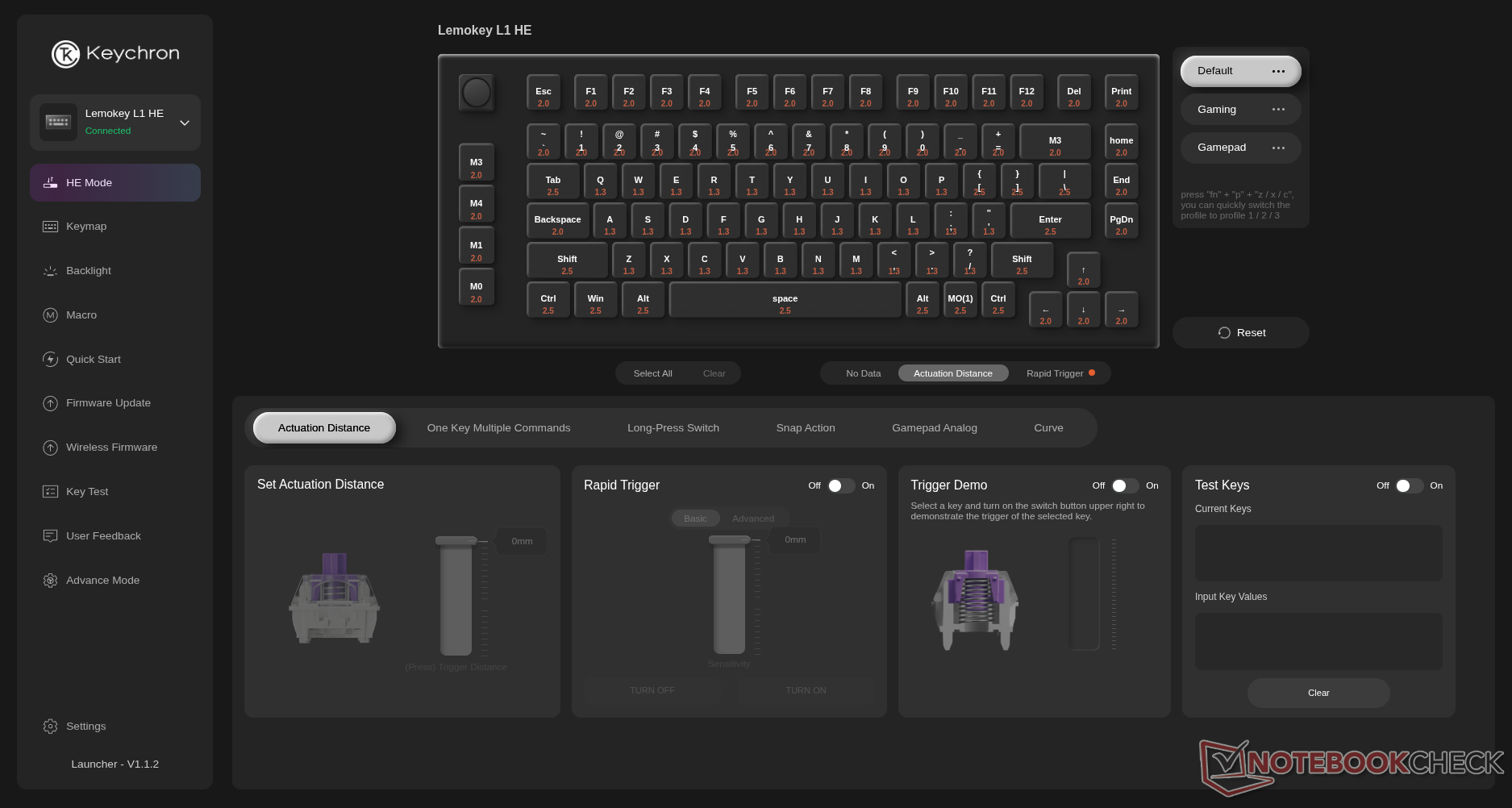 Personalizacja za pośrednictwem Keychron lub Lemokey Launcher - oba sterowniki internetowe są identyczne pod względem funkcjonalności i układu - jest doskonała, z prawdziwą personalizacją RGB dla każdego klawisza, personalizacją makr i wszystkimi wymyślnymi funkcjami efektu Halla, których oczekujemy od klawiatur do gier Keychron - odległość aktywacji, snap tap, DKS, szybki spust, a nawet tryb analogowy do emulacji kontrolera. Jak zwykle, Keychron jest jedną z niewielu marek, które oferują to ostatnie oprócz Wooting. Co ciekawe, nasz egzemplarz testowy miał usterkę, która powodowała, że klawisze na wyświetlaczu Launchera nie odzwierciedlały ustawień podświetlenia RGB, które były poprawnie wyświetlane na klawiaturze. Prawdopodobnie jest to problem z naszą jednostką lub błąd oprogramowania układowego, który zostanie rozwiązany. Tak czy inaczej, łatwo było to obejść, po prostu patrząc na klawiaturę podczas stosowania ustawień.