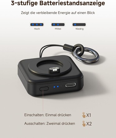 Ładowarka została zaprojektowana tak, aby była praktyczna do noszenia na breloczku do kluczy lub w plecaku, a także do ładowania smartwatcha podczas krótszych podróży bez konieczności odłączania ładowarki w domu lub szukania odpowiedniego złącza USB w podróży. Gdy bateria o pojemności 1200 mAh wyczerpie się, można ją naładować za pomocą kabla USB-C. Ładowarka ma wymiary 5 x 5 x 2 centymetry i waży 44 gramy.