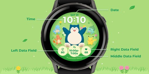 Oprócz daty i godziny, tarcza zegarka oferuje również miejsce na trzy okrągłe komplikacje, które można dowolnie wybierać, aby wyświetlać, na przykład, wykonane kroki, tętno lub szczegóły śledzenia snu bezpośrednio na tarczy zegarka. Druga tarcza zegarka, o nazwie Pokémon Sleep: I Choose You, pozwala użytkownikom wybierać spośród 48 różnych Pokémonów. Ta tarcza zegarka również dostosowuje pozę Pokémona do baterii ciała, ale tarcza zegarka oferuje miejsce na pięć komplikacji.