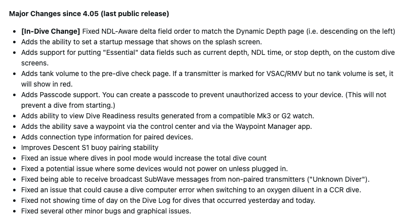 Garmin Descent X50i zyskuje wsparcie dla pól danych Essential na niestandardowych ekranach nurkowania; te metryki obejmują aktualną głębokość, głębokość zatrzymania i czas NDL. Użytkownicy mogą skonfigurować komunikat startowy, który będzie wyświetlany na ekranie powitalnym. Na stronie sprawdzania przed nurkowaniem można teraz zobaczyć objętość zbiornika. Ponadto wprowadzono szereg poprawek błędów, rozwiązujących problemy związane z trybem basenowym, komunikatami SubWave i dziennikiem nurkowania. Pełne informacje o wydaniu oprogramowania systemowego 5.09 można znaleźć poniżej.