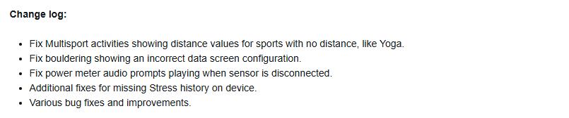 W przypadku aktywności Bouldering rozwiązano problem, w którym ekran danych był nieprawidłowo skonfigurowany. Ponadto usunięto błąd, który powodował odtwarzanie podpowiedzi dźwiękowych pomimo odłączenia niezbędnego czujnika. W ostatnim wierszu informacji o wydaniu stwierdzono, że istnieją inne poprawki błędów i ulepszenia bez podawania dalszych szczegółów.