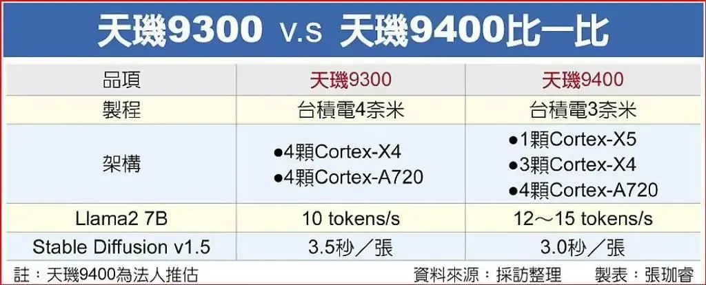 Nowy przeciek rzekomo po raz pierwszy nakreśla domniemane zalety 9400 w tym obszarze. Składa się on z tabeli uzupełniającej inne obecnie przewidywane ulepszenia, a mianowicie przejście na technologię 3nm i strategiczne wprowadzenie nowej generacji procesora Cortex-X5 cortex-X5 (w miejsce jednego z quadów 9300 X4s) z szacunkami wydajności dla 1 dobrze znanego dużego modelu językowego (LLM) i 1 równie popularnego generatora tekstu na obraz w porównaniu z Dimensity 9300.