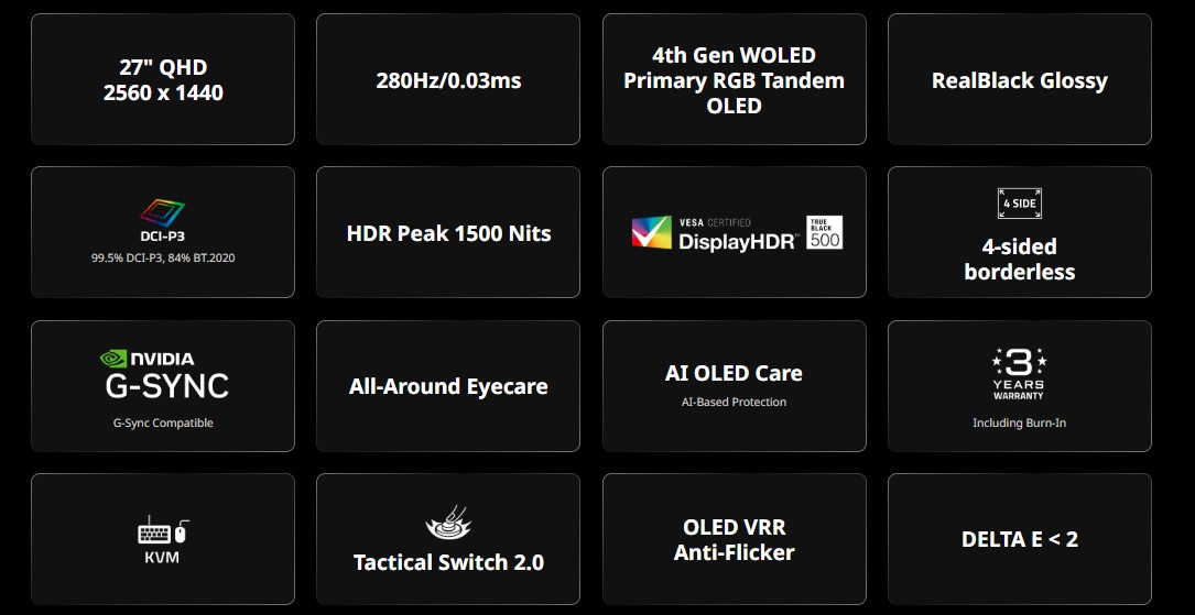 Gigabyte MO27Q28GR to 27-calowy monitor o rozdzielczości 2560 x 1440 i częstotliwości odświeżania 280 Hz. Podobnie jak w przypadku innych paneli Tandem OLED, uzyskano również znaczny wzrost jasności, osiągając do 1500 nitów w HDR przy 1,5% APL i około 335 nitów przy 100% APL. Panel posiada certyfikat DisplayHDR True Black 500 i pokrywa 95% przestrzeni barw DCI-P3. Ogólnie rzecz biorąc, jest on podobny do MO27Q28G, a jedyną różnicą jest powłoka ekranu.