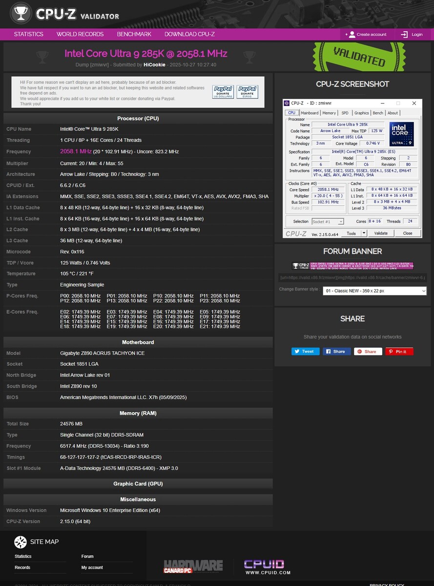 Hicookie stwierdził: "13K osiągnięte! Ogromne podziękowania dla ADATA Technology za znakomite pamięci i dla Intel Core Ultra 285K - jego kontroler pamięci jest fenomenalny. W połączeniu z płytą główną GIGABYTE Z890 AORUS TACHYON ICE, udało nam się przekroczyć 13 000 MT/s"