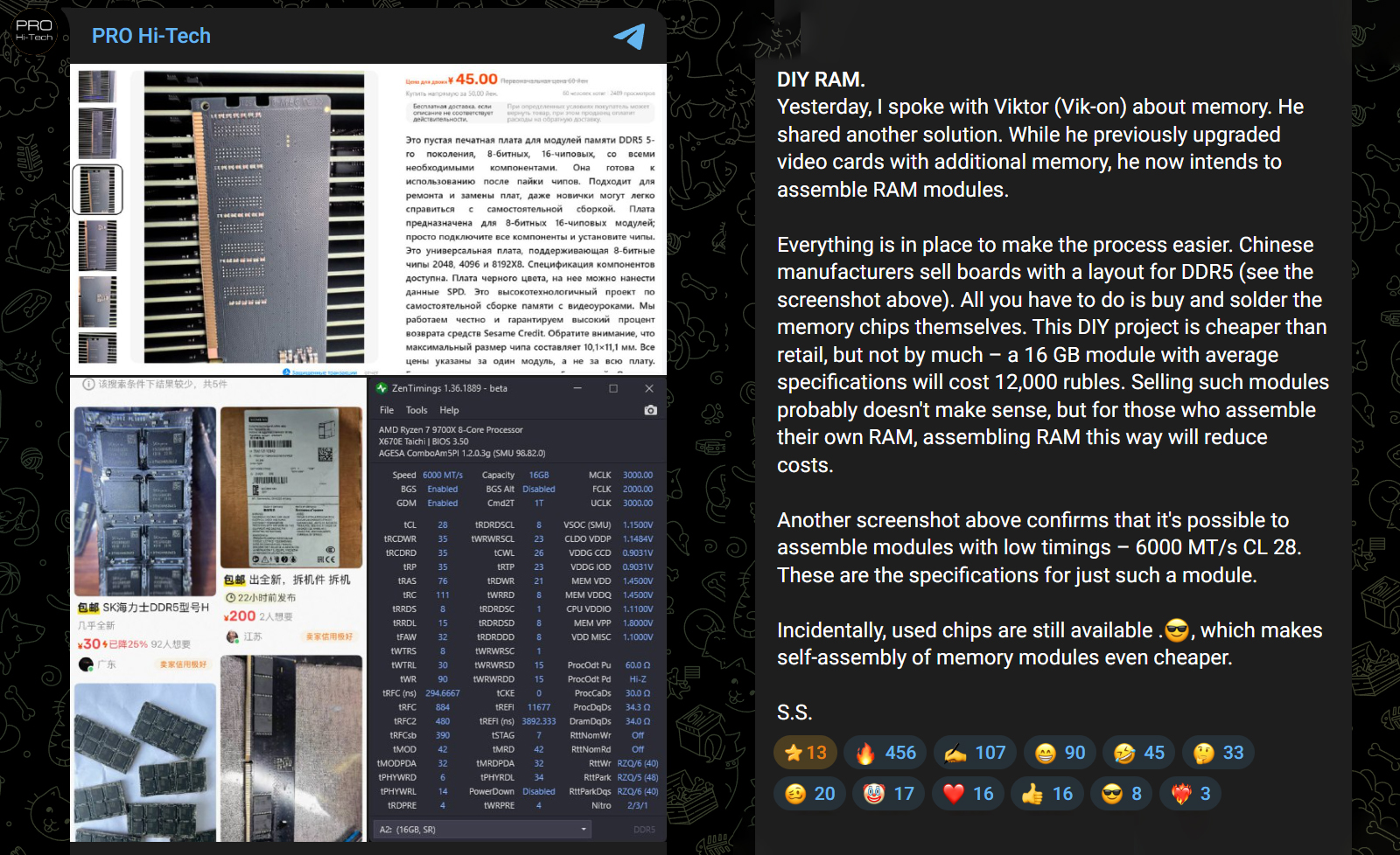 Jak podkreśla Pro Hi-Tech, te podstawowe części nie są trudne do zdobycia. Chińscy sprzedawcy oferują już gotowe do lutowania płytki PCB DDR5. Jednak takie podejście do samodzielnego montażu nie pozwoli użytkownikom zaoszczędzić zbyt wiele pieniędzy, przynajmniej nie w obecnym stanie. Szacunki obliczone przez Pro Hi-Tech i Viktora "Vik-On" wskazują, że 16 GB pamięci kosztuje około 12 000 rubli, czyli około 151 USD.