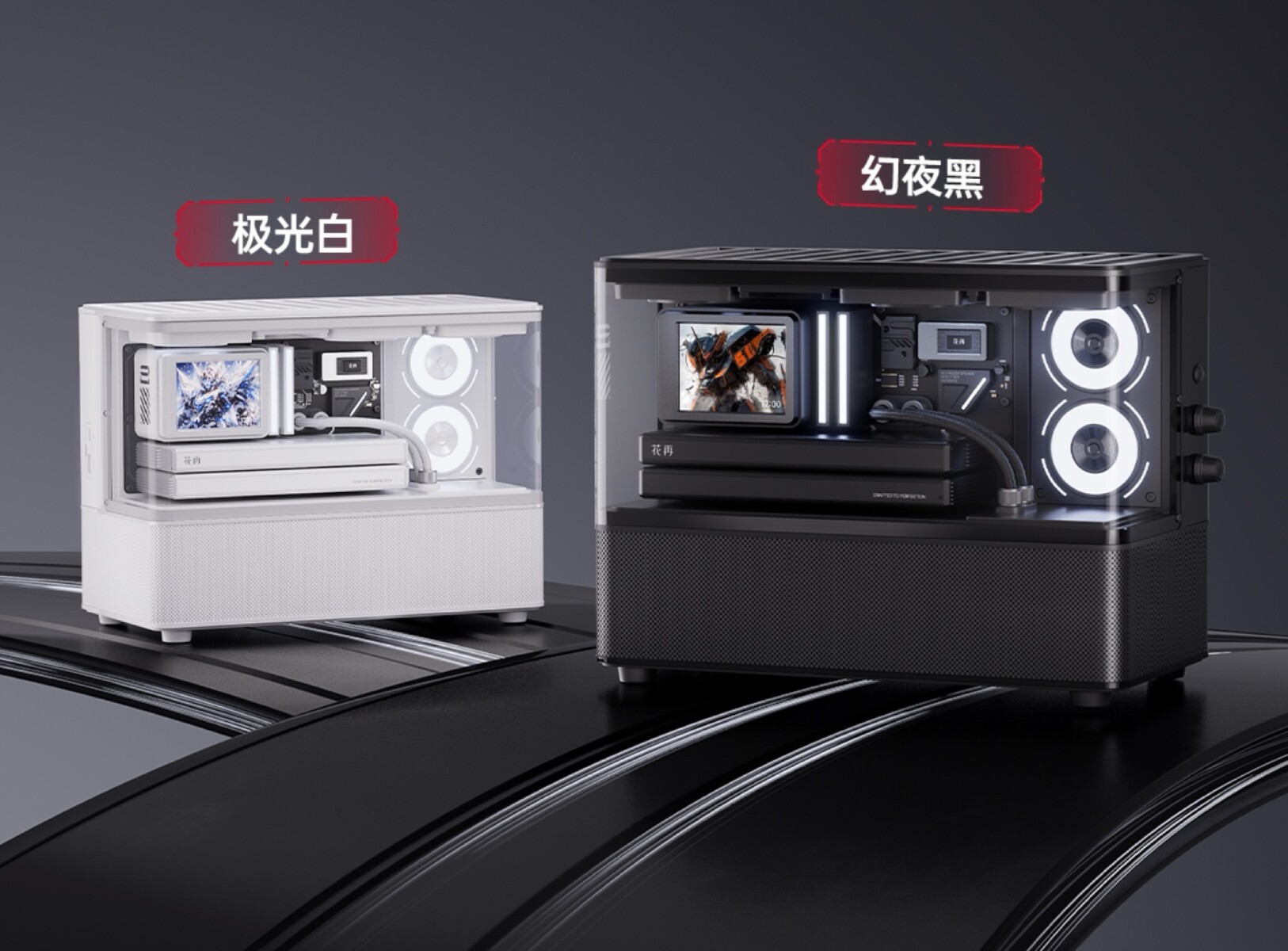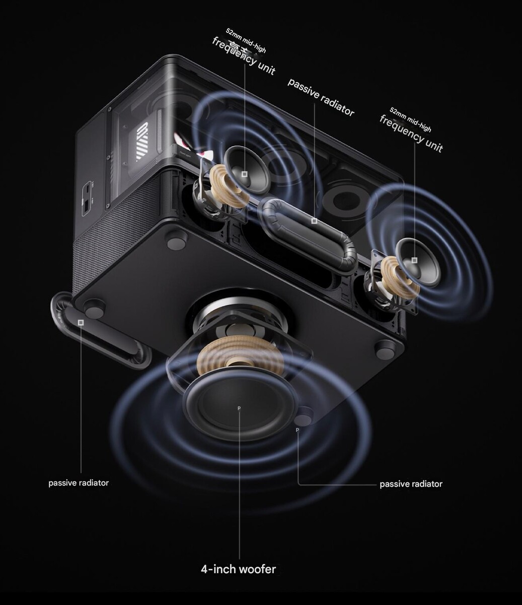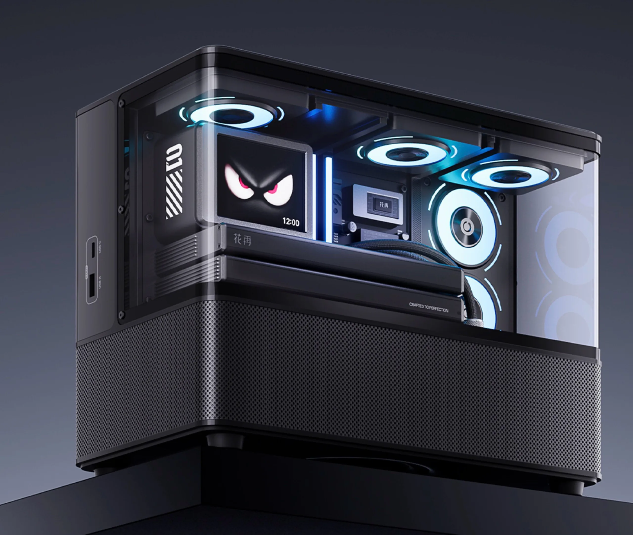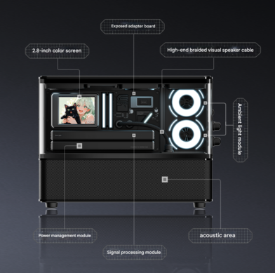 Grube kable głośnikowe w oplocie przypominają kanały systemu chłodzenia cieczą, a 2,8-calowy ekran dotykowy symbolizuje cooler CPU. Wyświetlacz ten może nie tylko wyświetlać grafikę i animacje, ale może nawet pokazywać aktualne obciążenie CPU i GPU, a także wykorzystanie pamięci RAM podłączonego komputera, dzięki czemu iluzja jest jeszcze bardziej skuteczna. Z tyłu głośnika znajduje się port USB-C i USB-A, z których każdy może ładować podłączone urządzenia z mocą do 35 W