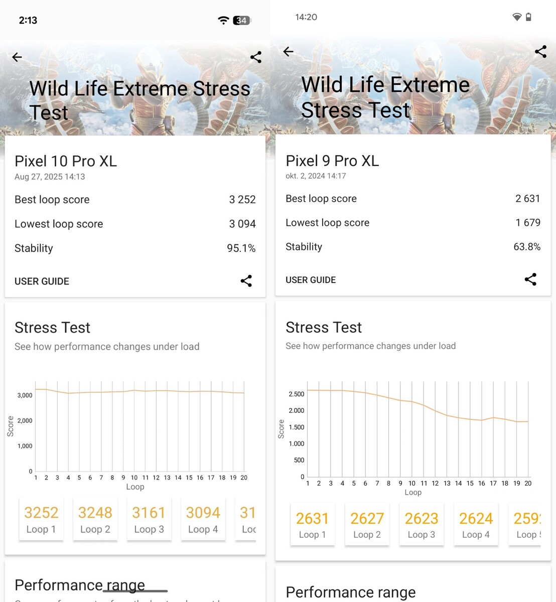 Na ten test mają co prawda wpływ czynniki takie jak temperatura otoczenia, ale wydajność Pixela 10 Pro XL wyróżnia się, a oficjalna baza danych 3DMark rejestruje 59,4% stabilności dla Galaxy S25 Ultra dla porównania. Liczba ta wzrasta do 68,9% na OnePlus 13-wciąż dość daleko od Pixel 10 Pro XL. Podczas gdy 3DMark nie ma oficjalnych danych porównawczych dla Pixel 9 Pro XLtelefon ostatniej generacji wykazywał w przeszłości stabilność na poziomie 63,8% w tym teście, potencjalnie wskazując na wymierną korzyść oferowaną przez przejście na węzeł TSMC dla Tensor G5.