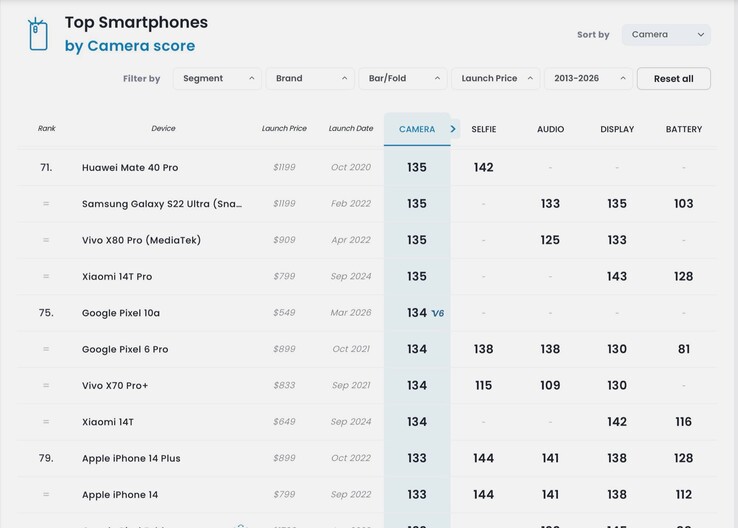 Trudno się zatem dziwić, że Pixel 10a uzyskał tylko 134 punkty w analizie aparatu DxOMark analiza aparatu - sześć punktów więcej niż Pixel 9a, co można przypisać ulepszeniom w przetwarzaniu obrazu. To wystarczy, aby zająć 75. miejsce na liście przebojów DxOMark. Z 136 punktami nawet Pixel 8a wypada lepiej, ponieważ dwa lata temu Google zainstalował główny aparat 64 MP z większym czujnikiem 1/1,73 cala. Znacznie starszy Apple iPhone 15 znacznie wyprzedza Pixel 10a z 145 punktami